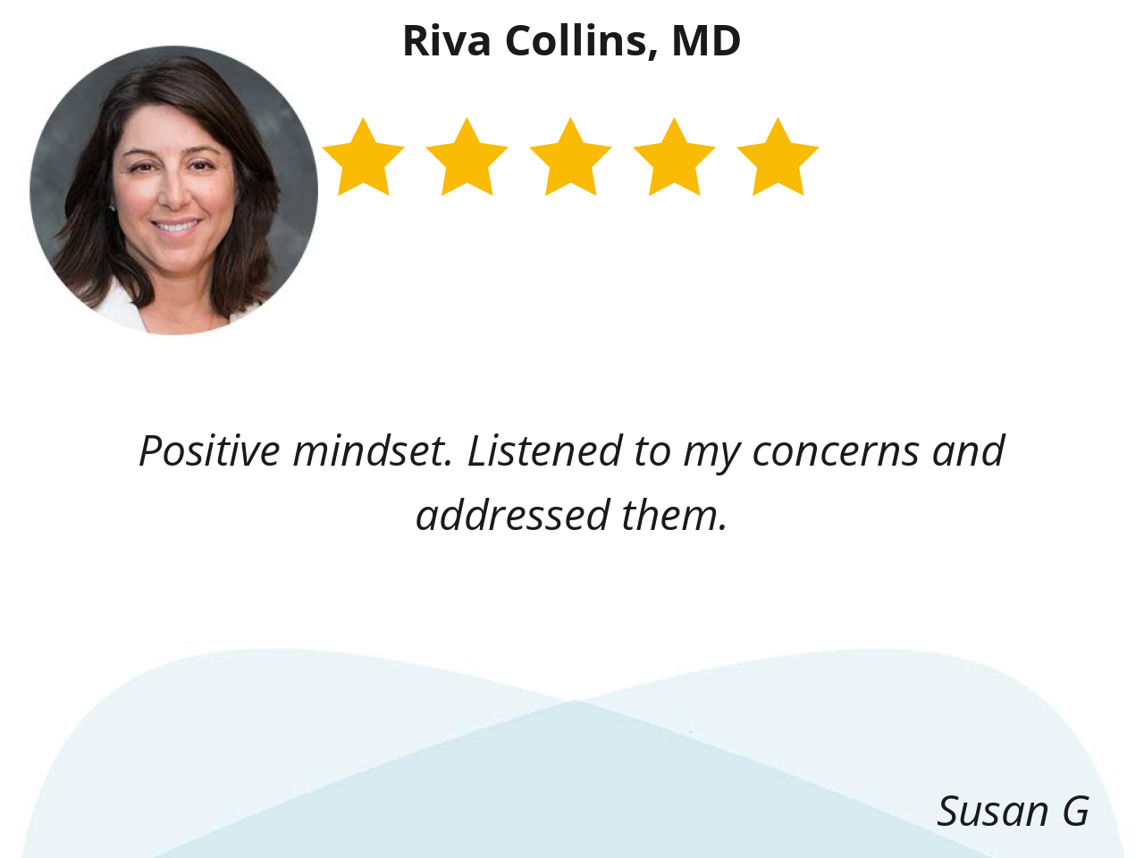 Five million stars to Dr. Riva Collins. Dr. Collins is an excellent communicator. She listens to my concerns before explaining her diagnosis. Dr. Collins is organized and conscientious. I have a clear plan of action upon leaving her office. This is evident by the testing which she orders and the prescriptions which she writes. When I walk out of her office, I know she cares about me.
