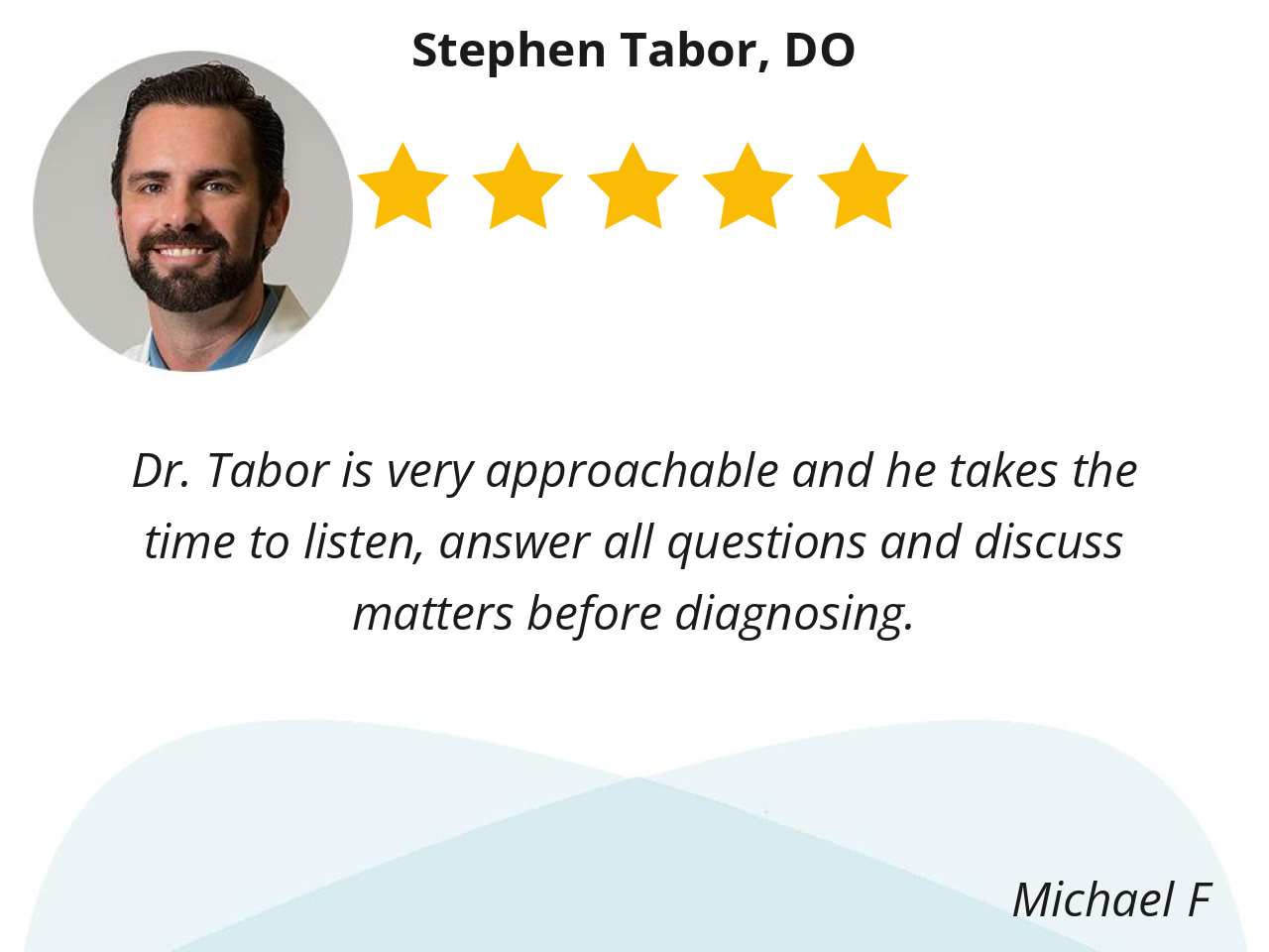 Dr. Tabor is very approachable and he takes the time to listen, answer all questions and discuss matters before diagnosing.