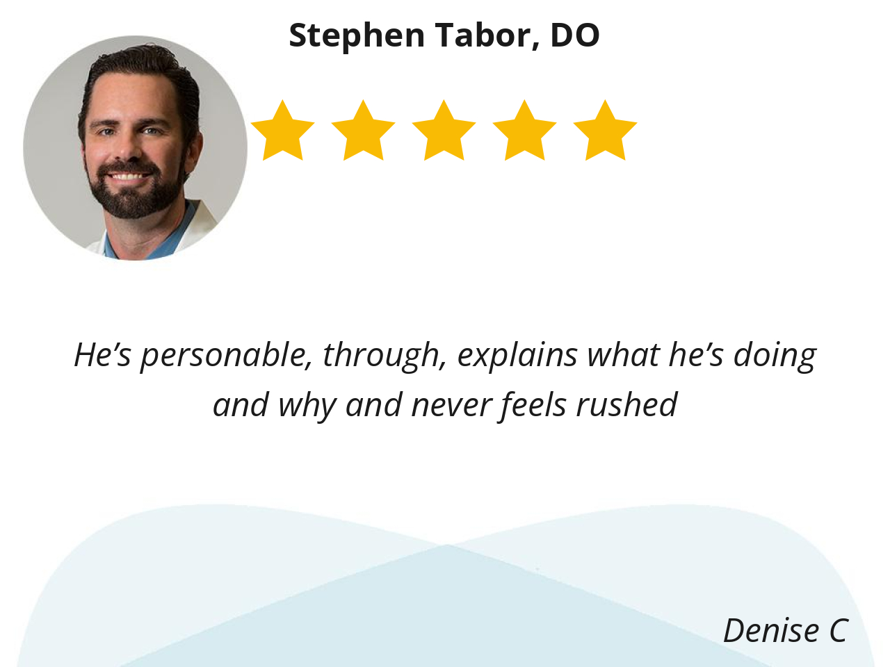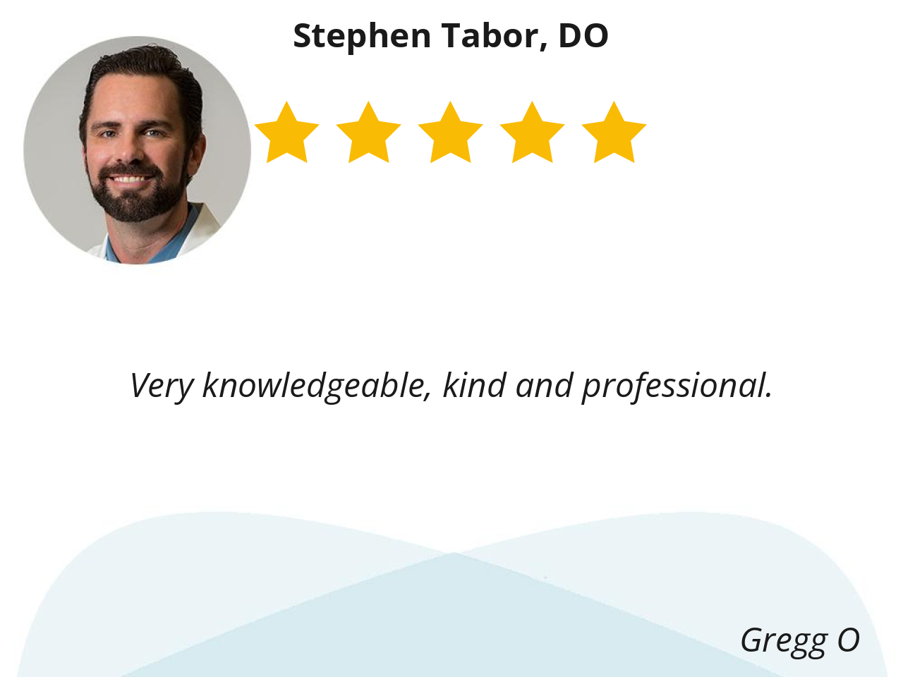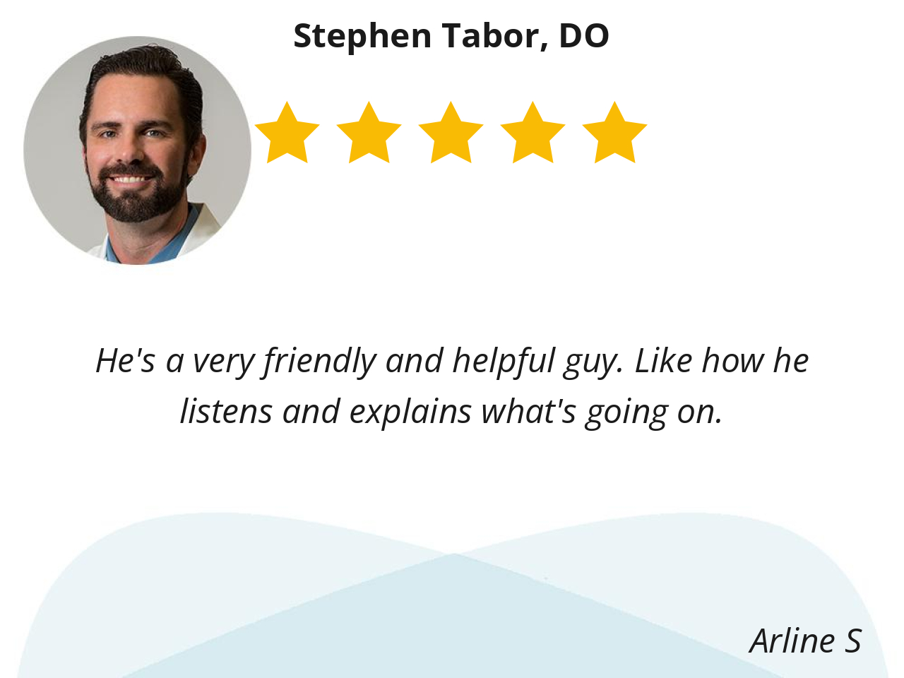 Dr. Tabor is kind, compassionate, and knew exactly what was wrong with my hand. He was able to treat it in office and I am feeling better.