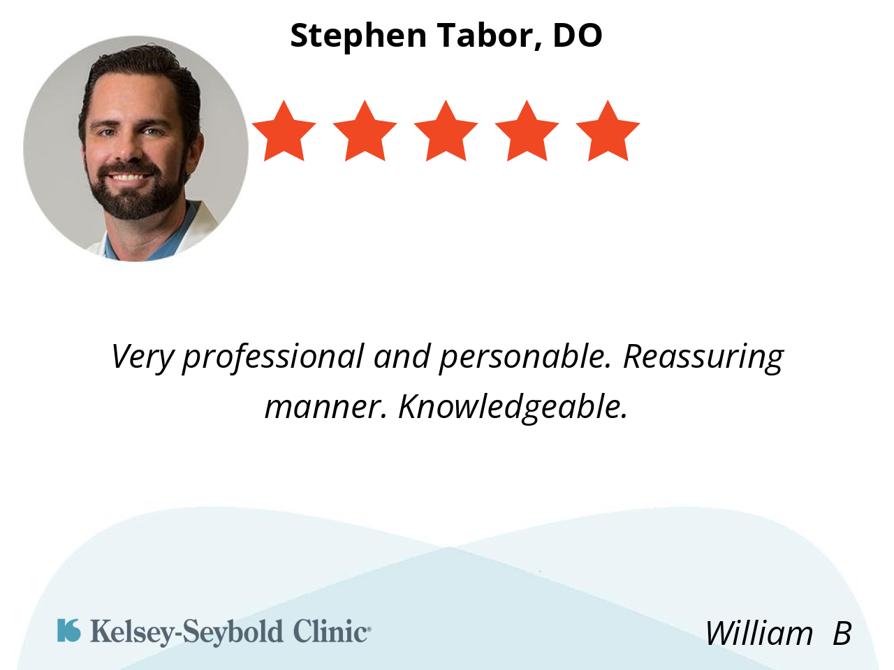 Dr. Tabor was very friendly and listened to my concerns and ordered X-rays immediately. He explained why my wrist was in pain. He showed me and explained the X-ray images that he ordered. I had an appointment scheduled for 2:30 pm but I was at Kelsey-Seybold with my wife the morning of the day of my appointment. I asked a lobby desk attendant if I could see Dr. Tabor while I was there and I was being called in to see him within just a few minutes. I really appreciated his demeanor. His assistants were very personal and made me feel at ease.