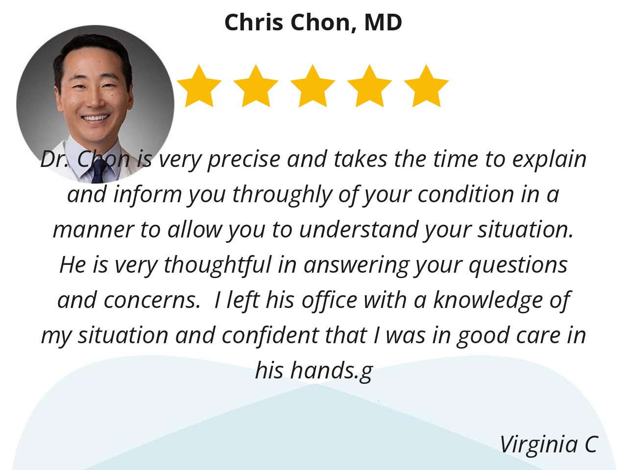 Dr.Chon is very knowledgeable, patient and has great bedside manners. He’s very easy to talk to.