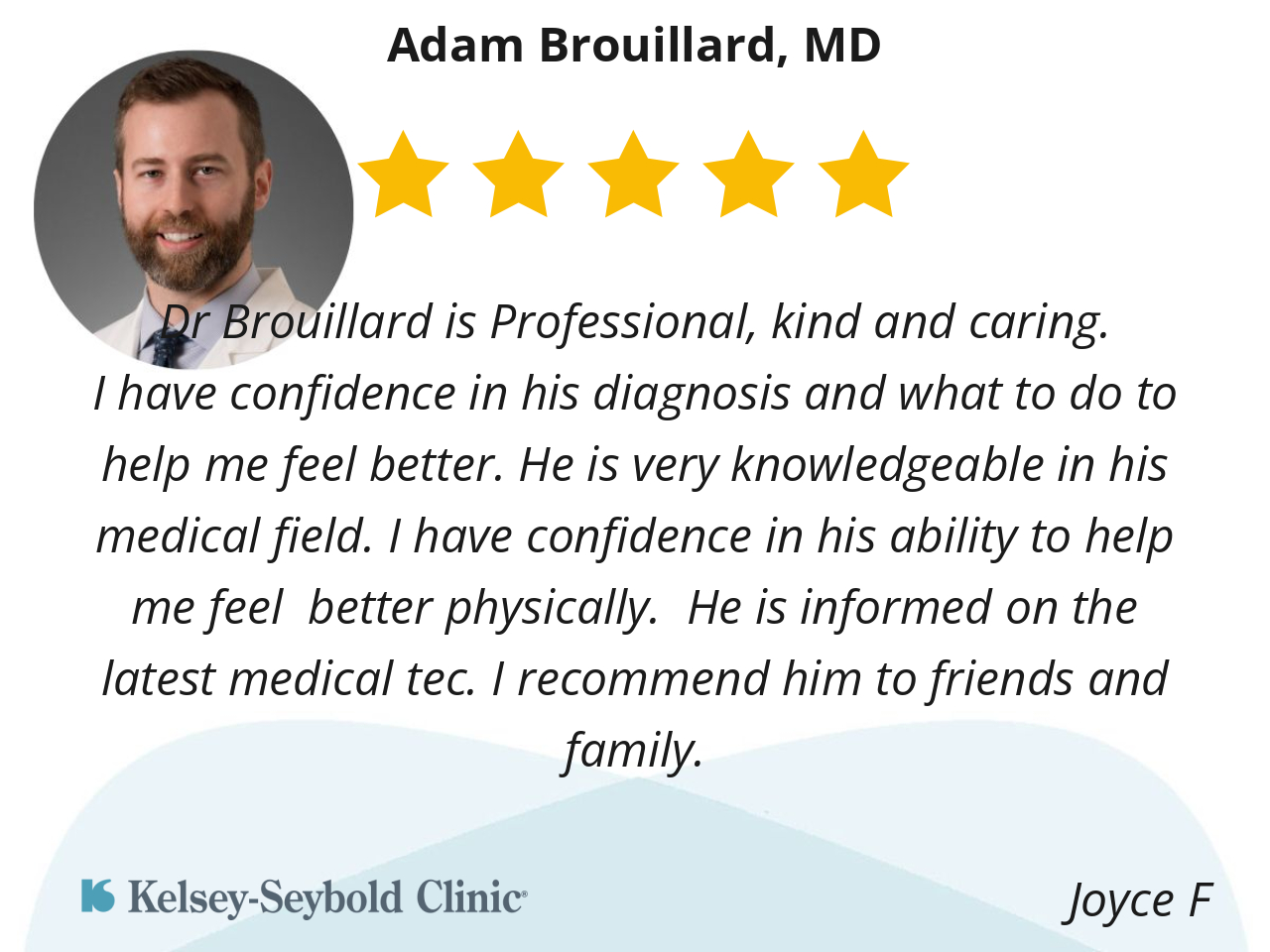 I have confidence in his diagnosis and what to do to help me feel better. He is very knowledgeable in his medical field. I have confidence in his ability to help me feel better physically. He is informed on the latest medical tec. I recommend him to friends and family.