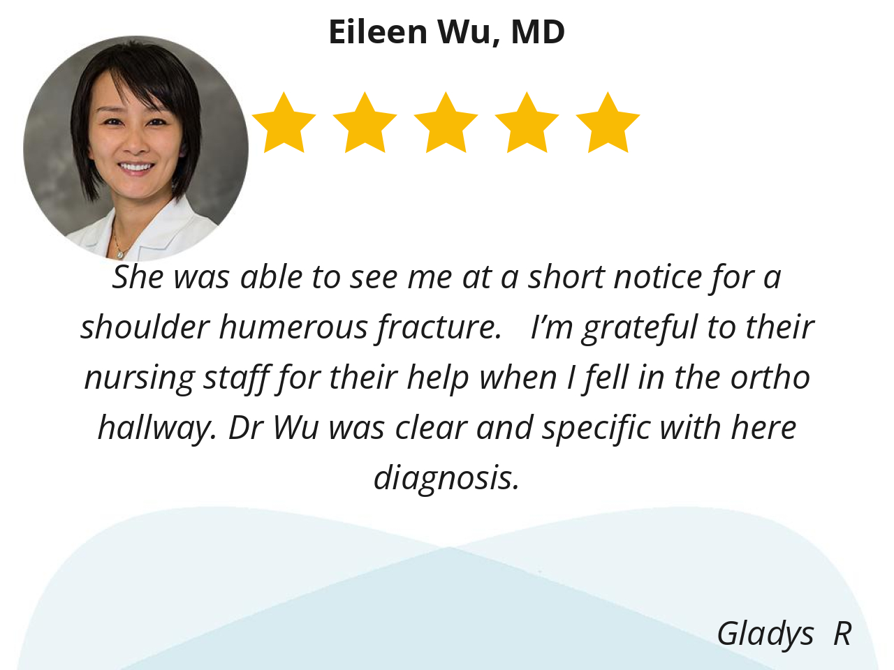 She was able to see me at a short notice for a shoulder humerous fracture. I’m grateful to their nursing staff for their help when I fell in the ortho hallway. Dr Wu was clear and specific with here diagnosis.