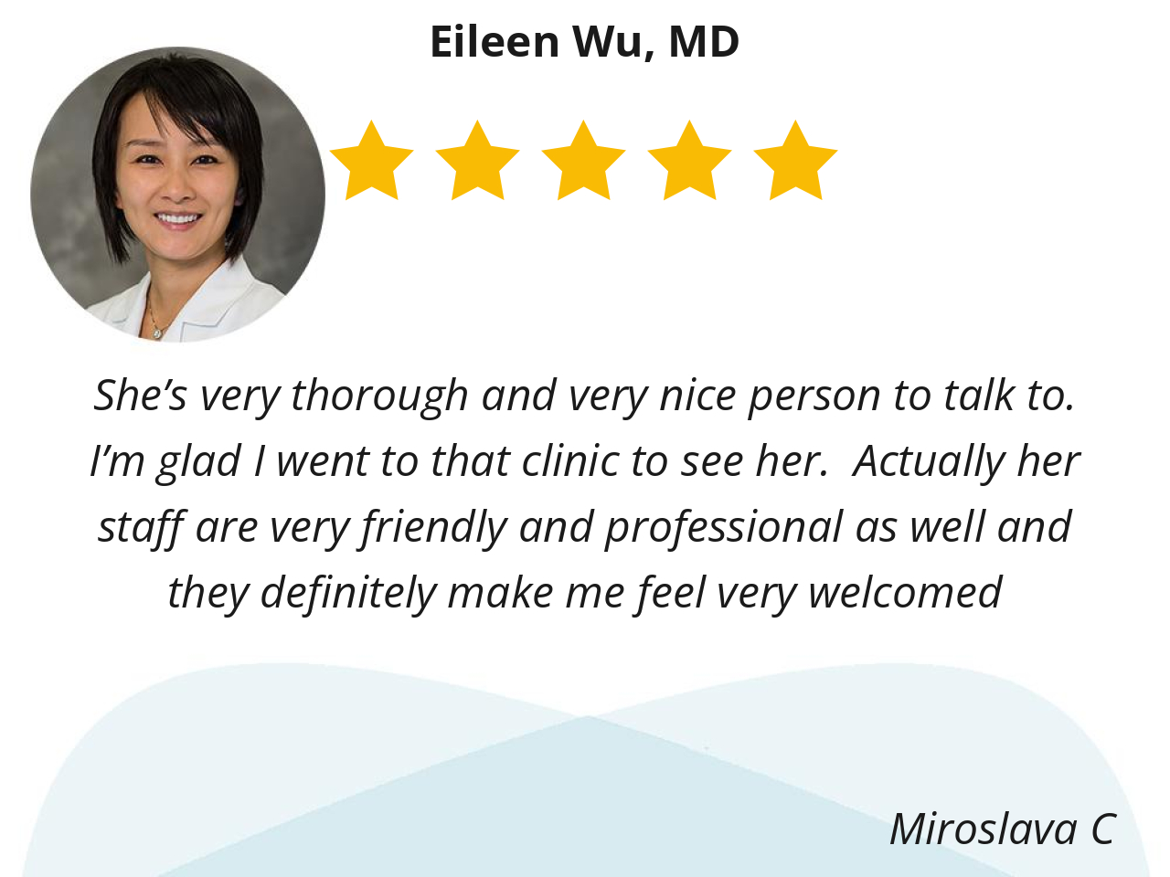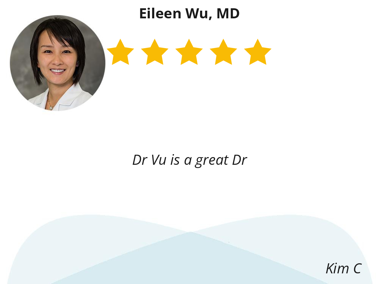 Dr. Wu is an awesome Individual. She always takes great care to listen carefully in order to properly treat my situation. Dr. Wu goes above, and beyond, in providing excellent health care for her patients.