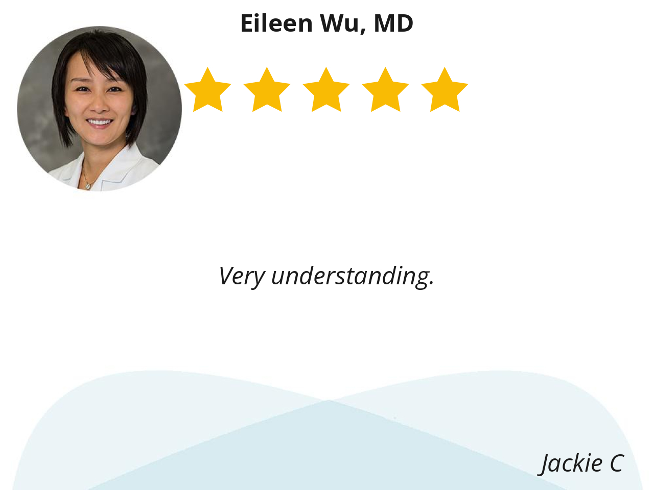 Dr. Wu has been wonderful from the first time we met her. She walked us through my surgery and answered all our questions clearly. Our experience with her has been amazing!
