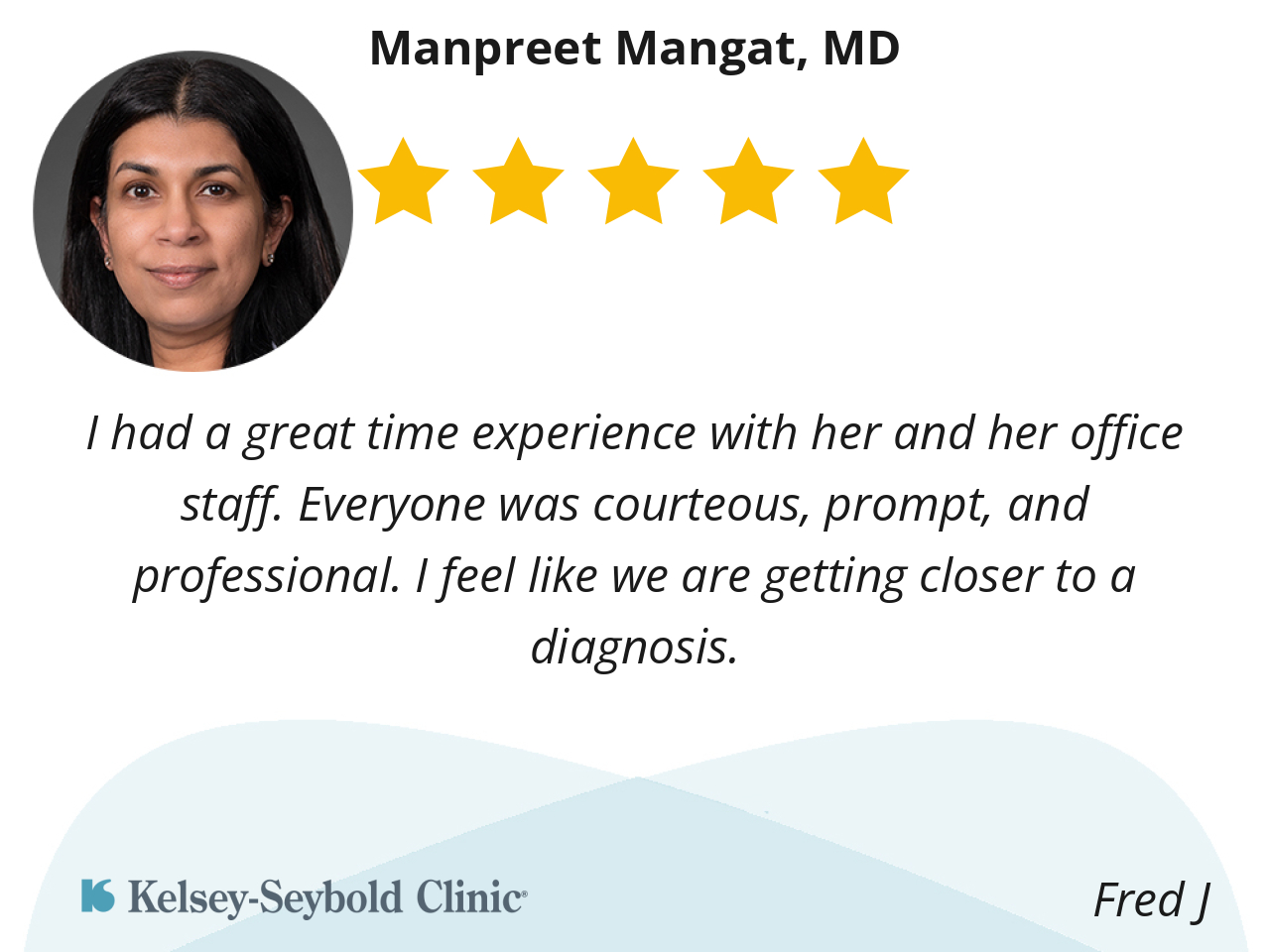 Dr. Mangat is very knowledgeable, listens & ask questions about what is going on with your health to give you the best line of treatment. I also like the fact that she is dedicated to her specialty & shows compassion.