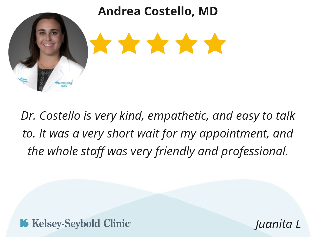 Dr. Costello is very kind, empathetic, and easy to talk to. It was a very short wait for my appointment, and the whole staff was very friendly and professional.