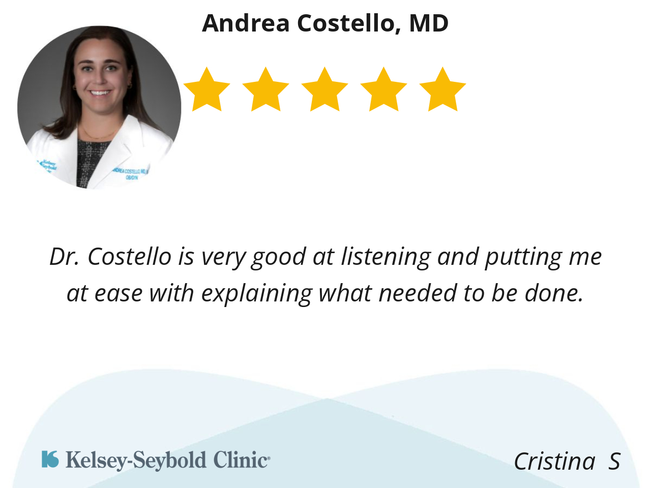 This was my first time seeing Dr. Costello and I would like to express how her kind bedside manner made me feel more comfortable during my visit. She was kind enough to listen to what I had to say and provide that empathy we all need as patients.