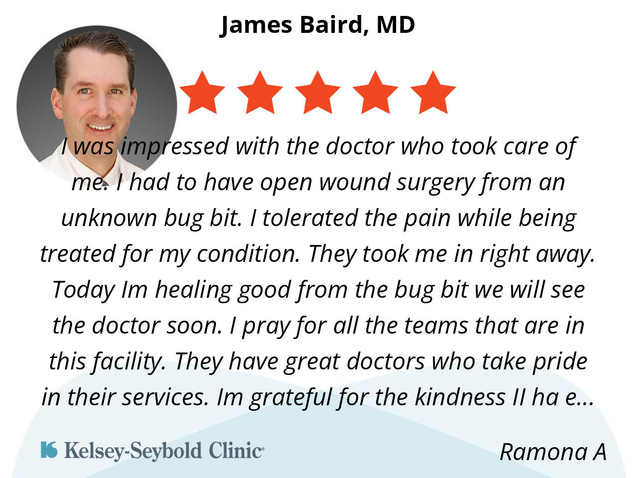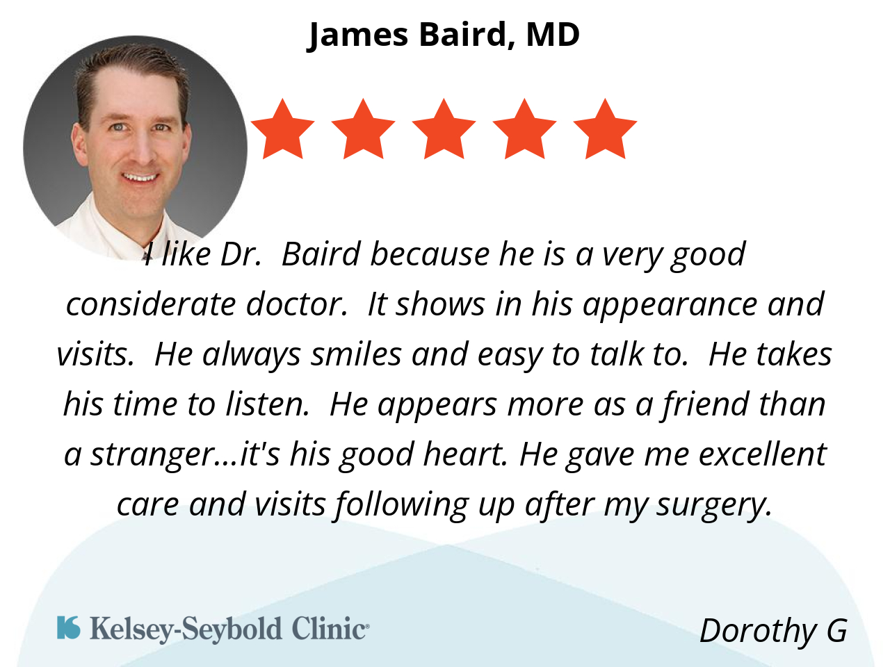 I like Dr. Baird because he is a very good considerate doctor. It shows in his appearance and visits. He always smiles and easy to talk to. He takes his time to listen. He appears more as a friend than a stranger...it's his good heart. He gave me excellent care and visits following up after my surgery.