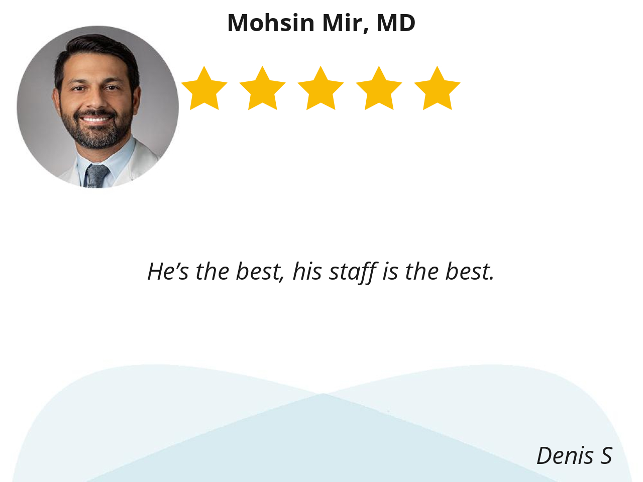 Dr. Mir take the time to explain every step and possible outcomes in plain English. Everything went exactly as he said; he and his staff are friendly professionals and made me feel less stressful about the entire procedure.