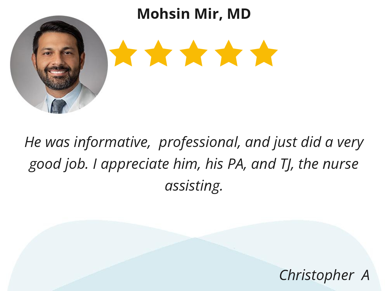 Dr. Mir is a highly skilled surgeon whose bedside manner is professional and he is able to answer most questions before I even asked any but willingly answered all.