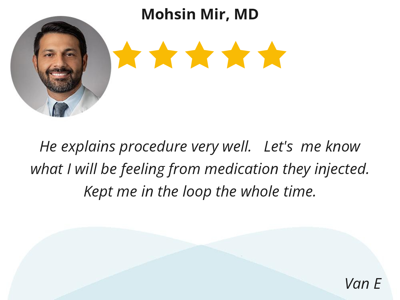 Dr. Mir and his staff use ordinary language to explain the procedure. Such a relief to NOT be annoyed with medical jargon.