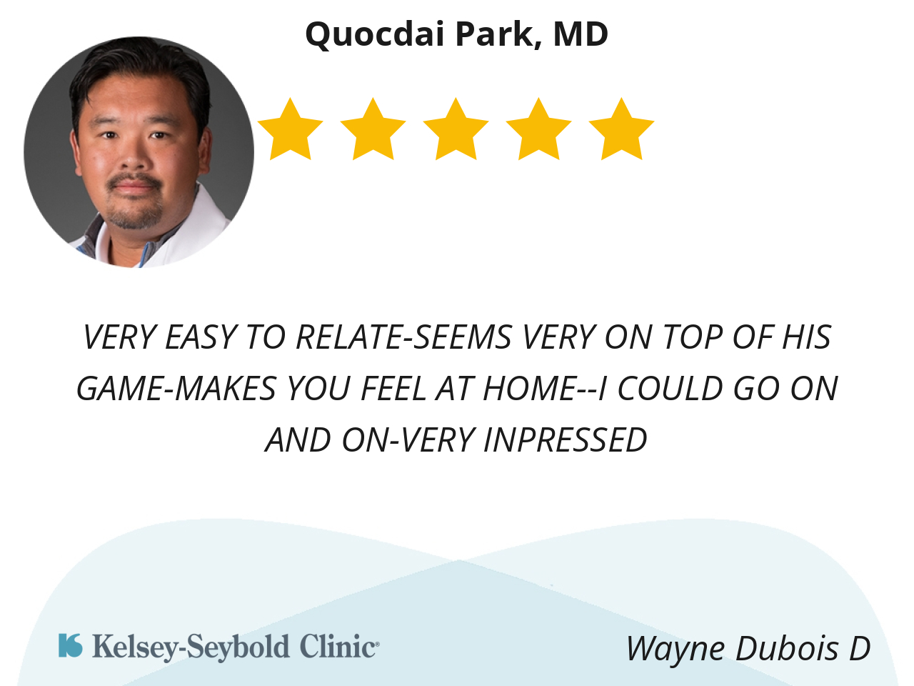 Dr. Park is personable, always very pleasant to meet. He is very professional and helpful in providing information that helps me understand my ailments or symptoms better, such as the cause of it, what it is connected to, what other indications say my condition is not so bad and how he will address the problem to get me the good health I need. He never appears to be in a hurry. His interactions with me on each visit always makes me feel that I am being treated by a knowledge doctor.