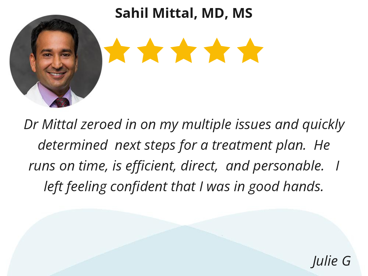 Dr Mittal zeroed in on my multiple issues and quickly determined next steps for a treatment plan. He runs on time, is efficient, direct, and personable. I left feeling confident that I was in good hands.
