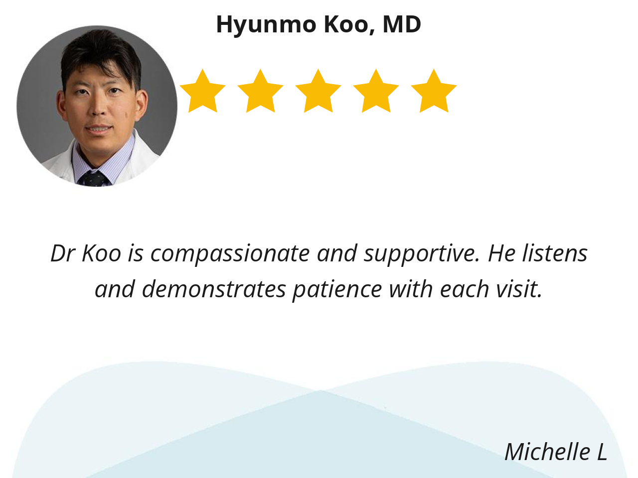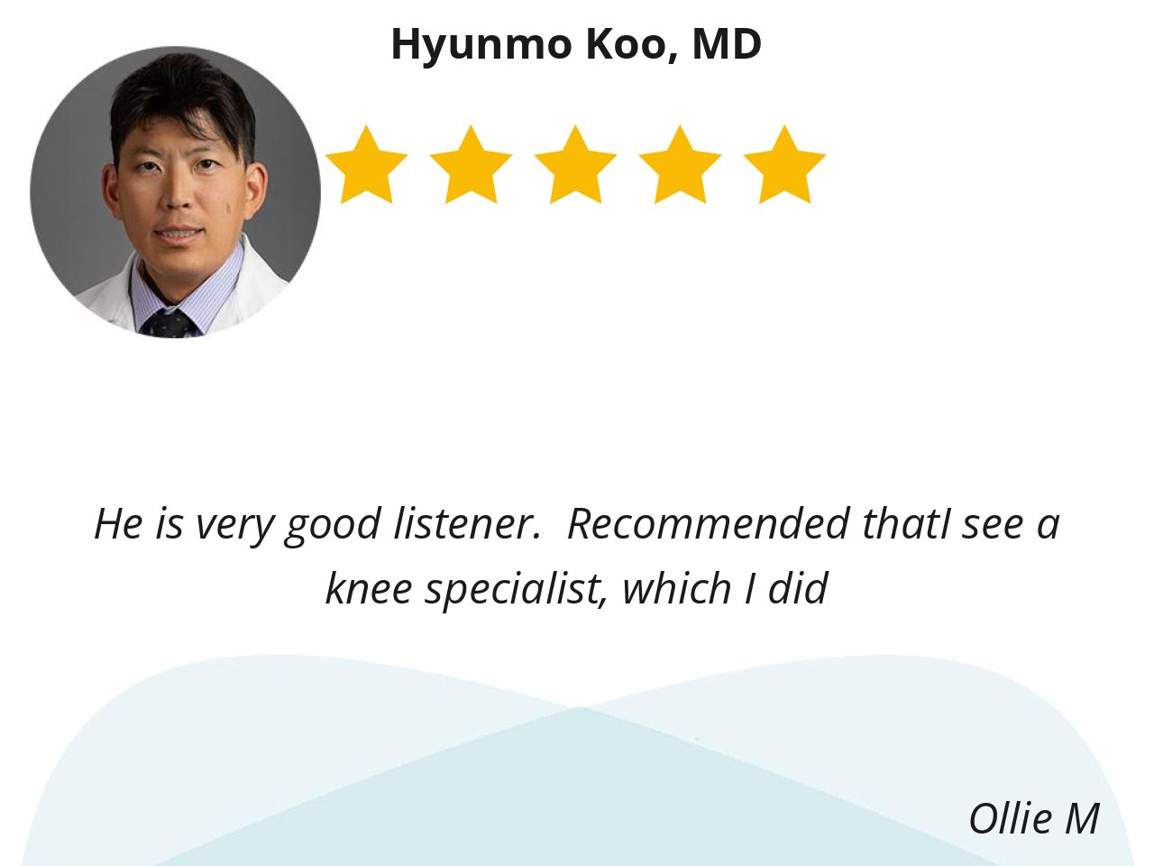 I love the fact that Dr. Koo answered all my questions. He was very patient and thoroughly went through my chart to clarify information. He didn't make me feel rushed.