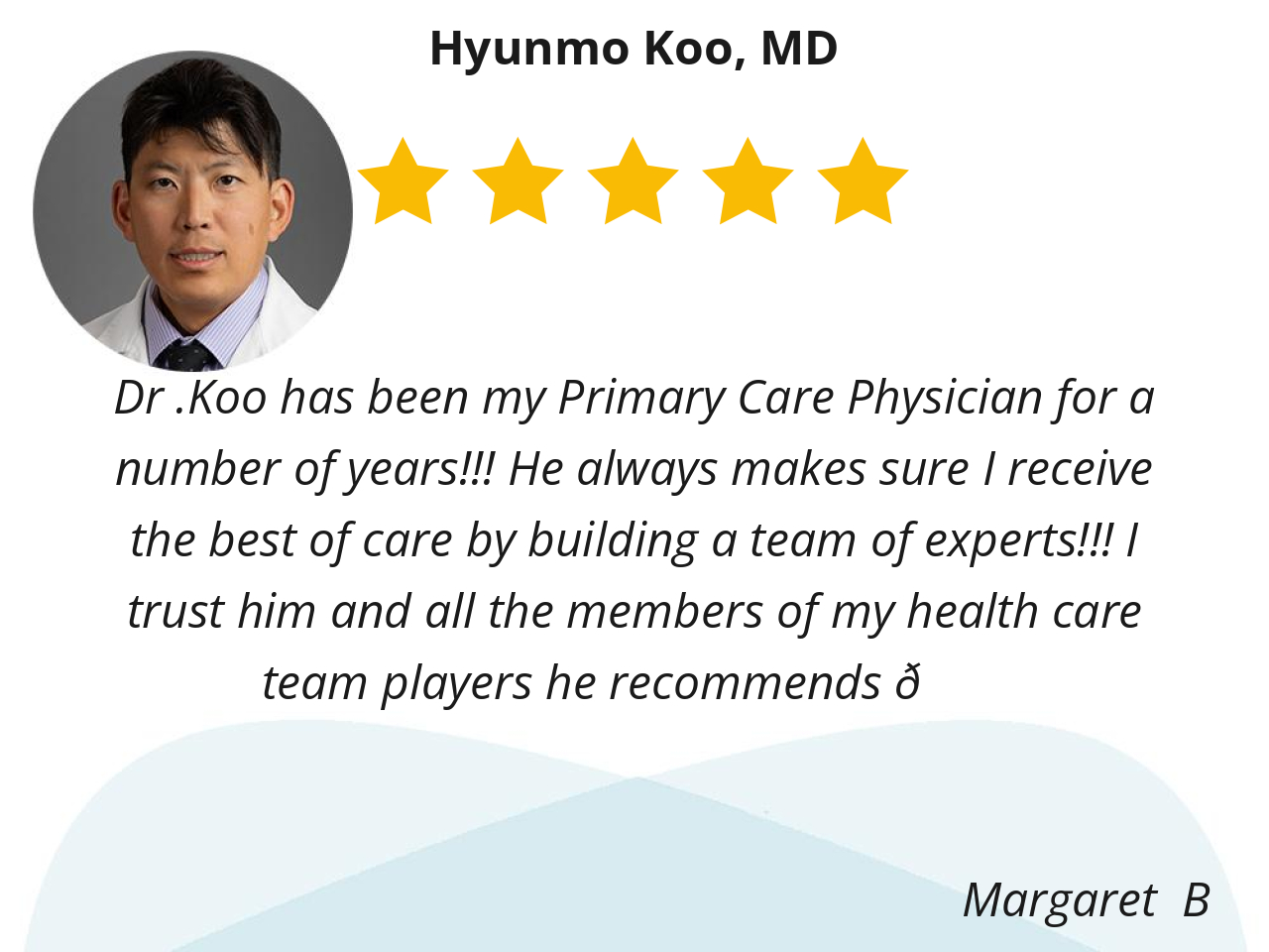 Dr .Koo has been my Primary Care Physician for a number of years!!! He always makes sure I receive the best of care by building a team of experts!!! I trust him and all the members of my health care team players he recommends 😊