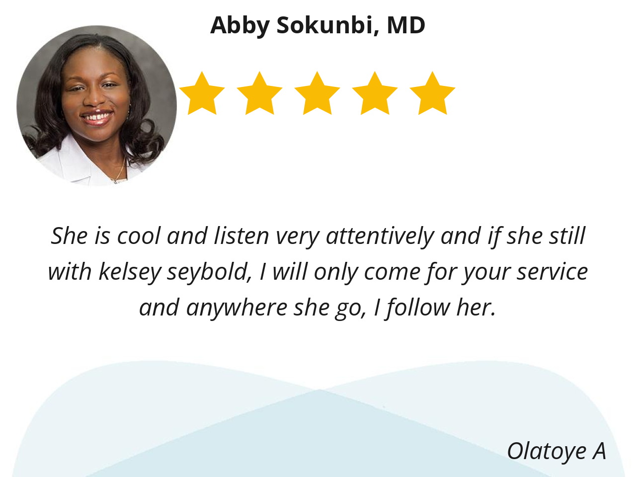 Dr Abby Sokunbi is a great doctor. This was my first time visiting her and she paid attention to all my concerns. She patiently looked over my medical records and explained everything that I needed to know to me. She is very good about explaining preventative measures to keeping disease at bay.