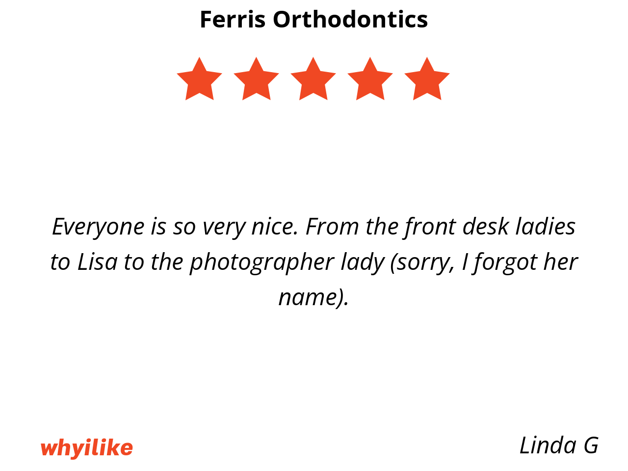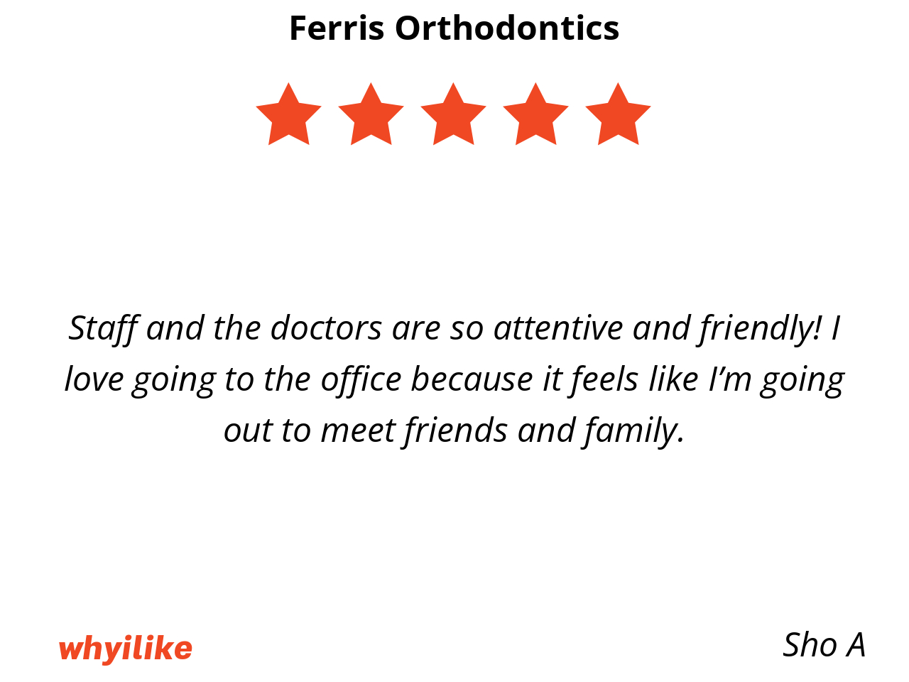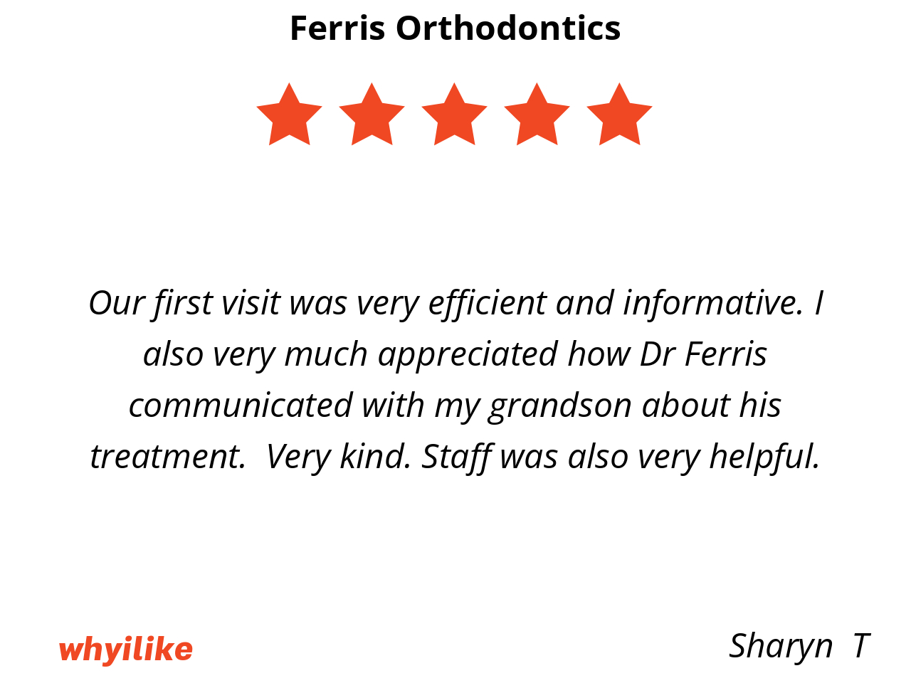 Our first visit was very efficient and informative. I also very much appreciated how Dr Ferris communicated with my grandson about his treatment. Very kind. Staff was also very helpful.