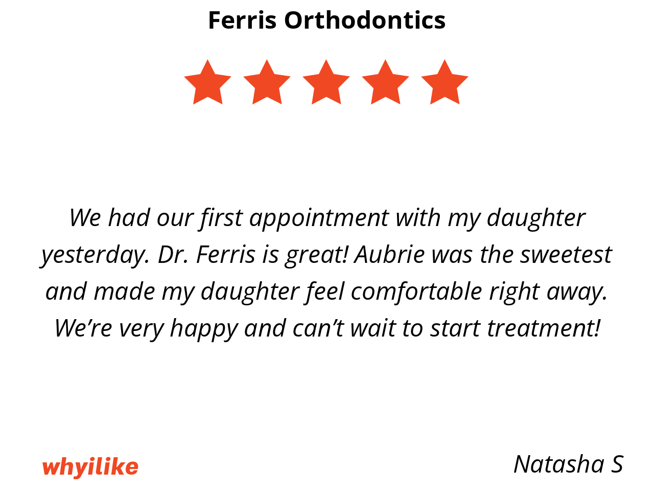 We had our first appointment with my daughter yesterday. Dr. Ferris is great! Aubrie was the sweetest and made my daughter feel comfortable right away. We’re very happy and can’t wait to start treatment!