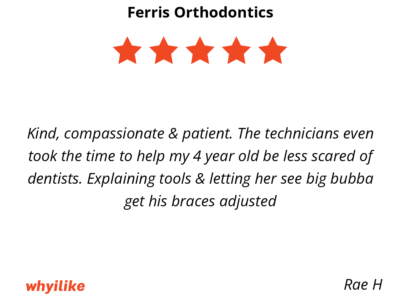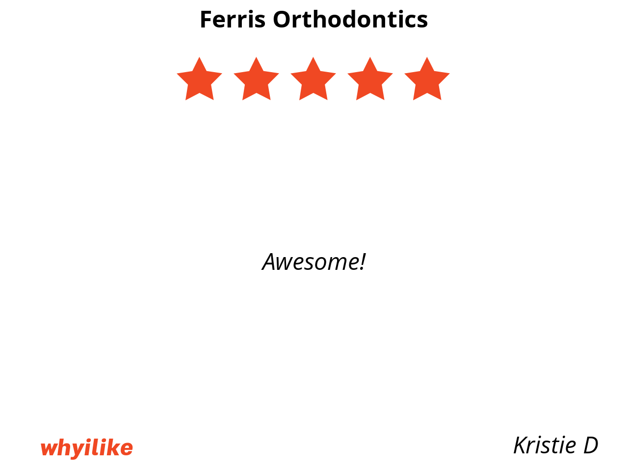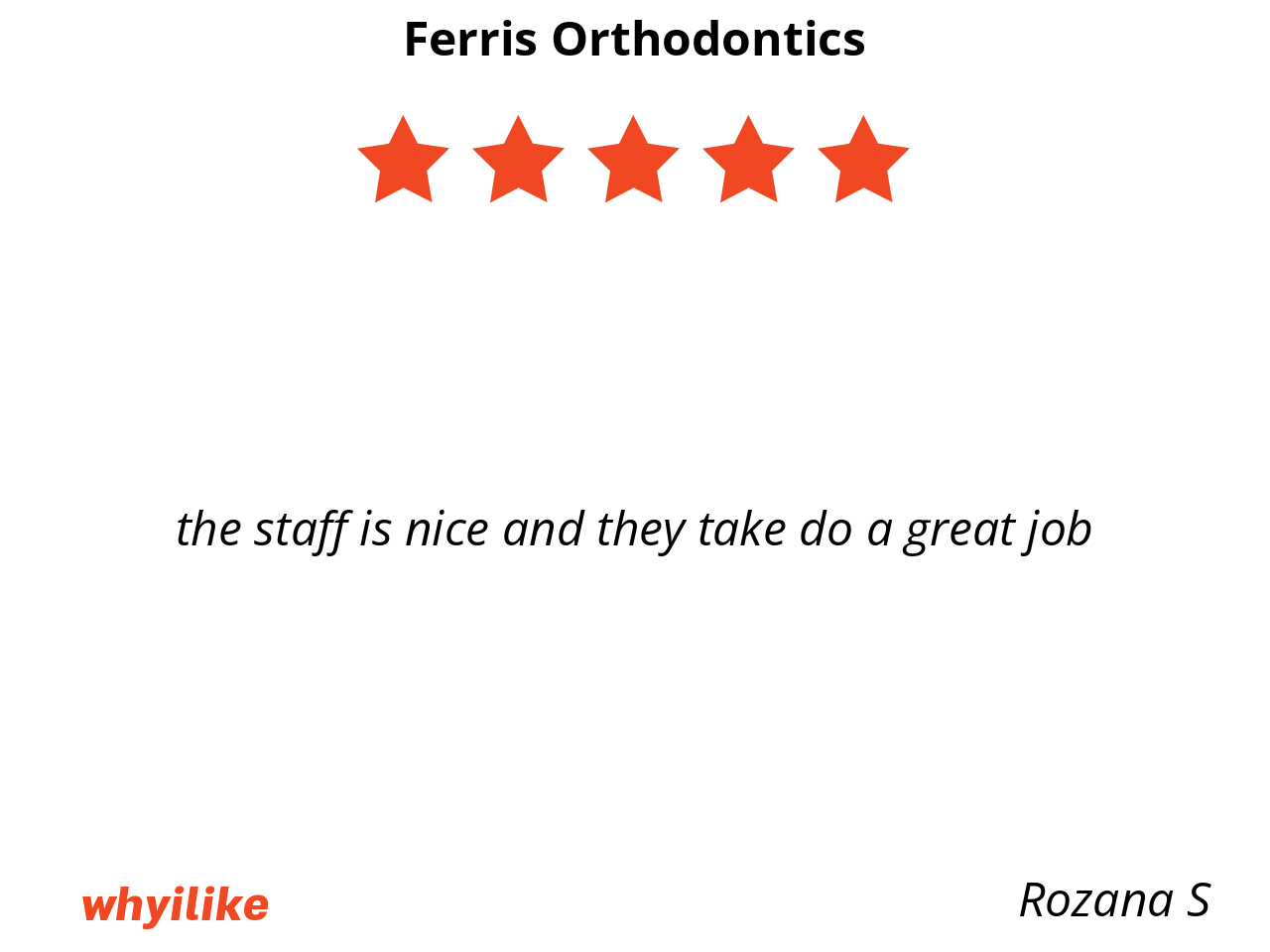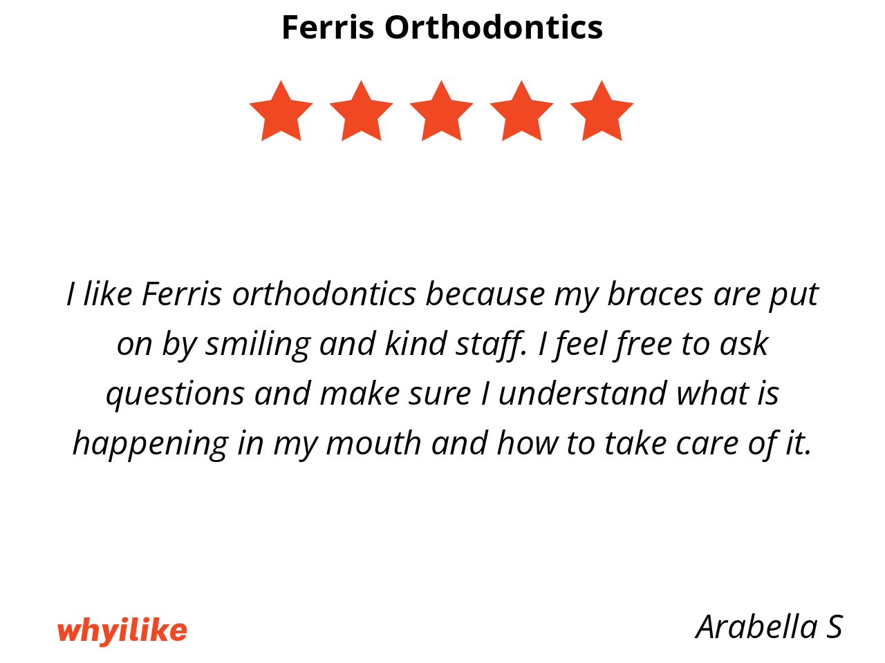 I like Ferris orthodontics because my braces are put on by smiling and kind staff. I feel free to ask questions and make sure I understand what is happening in my mouth and how to take care of it.