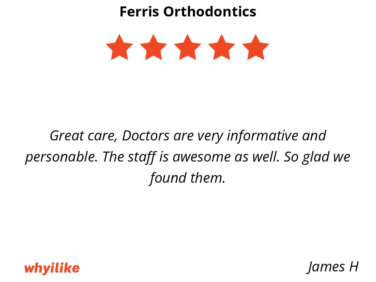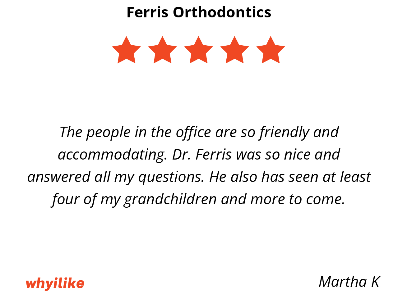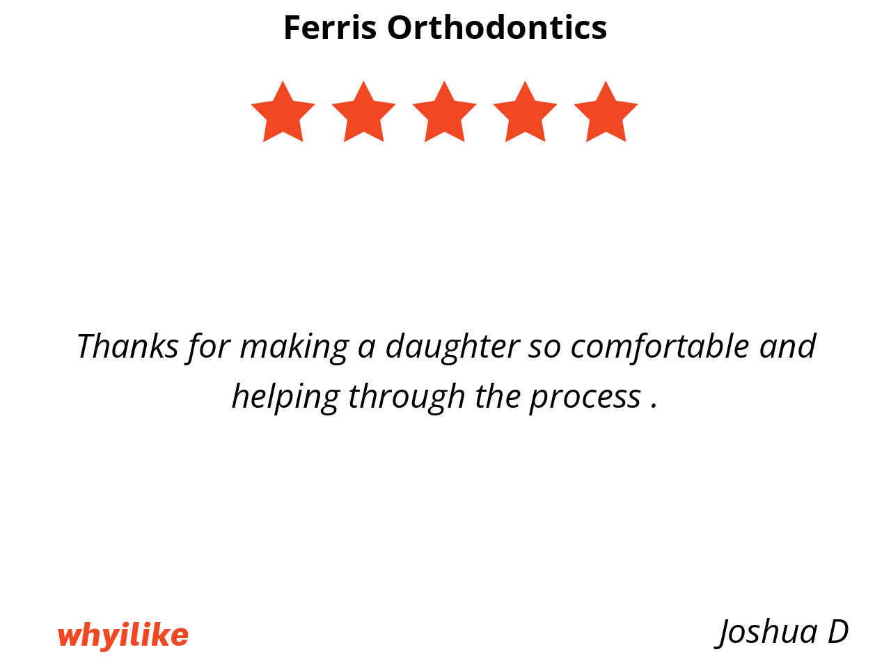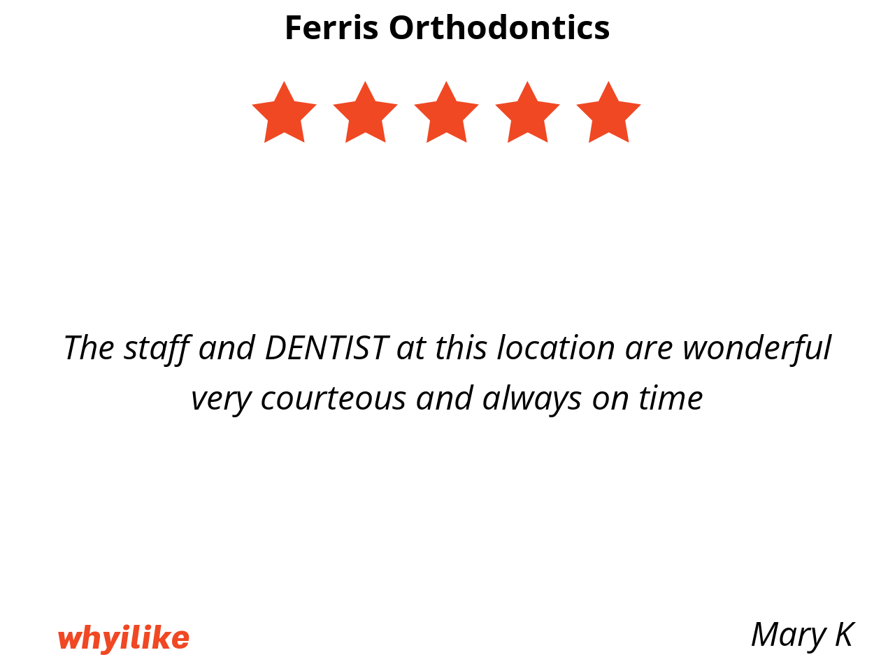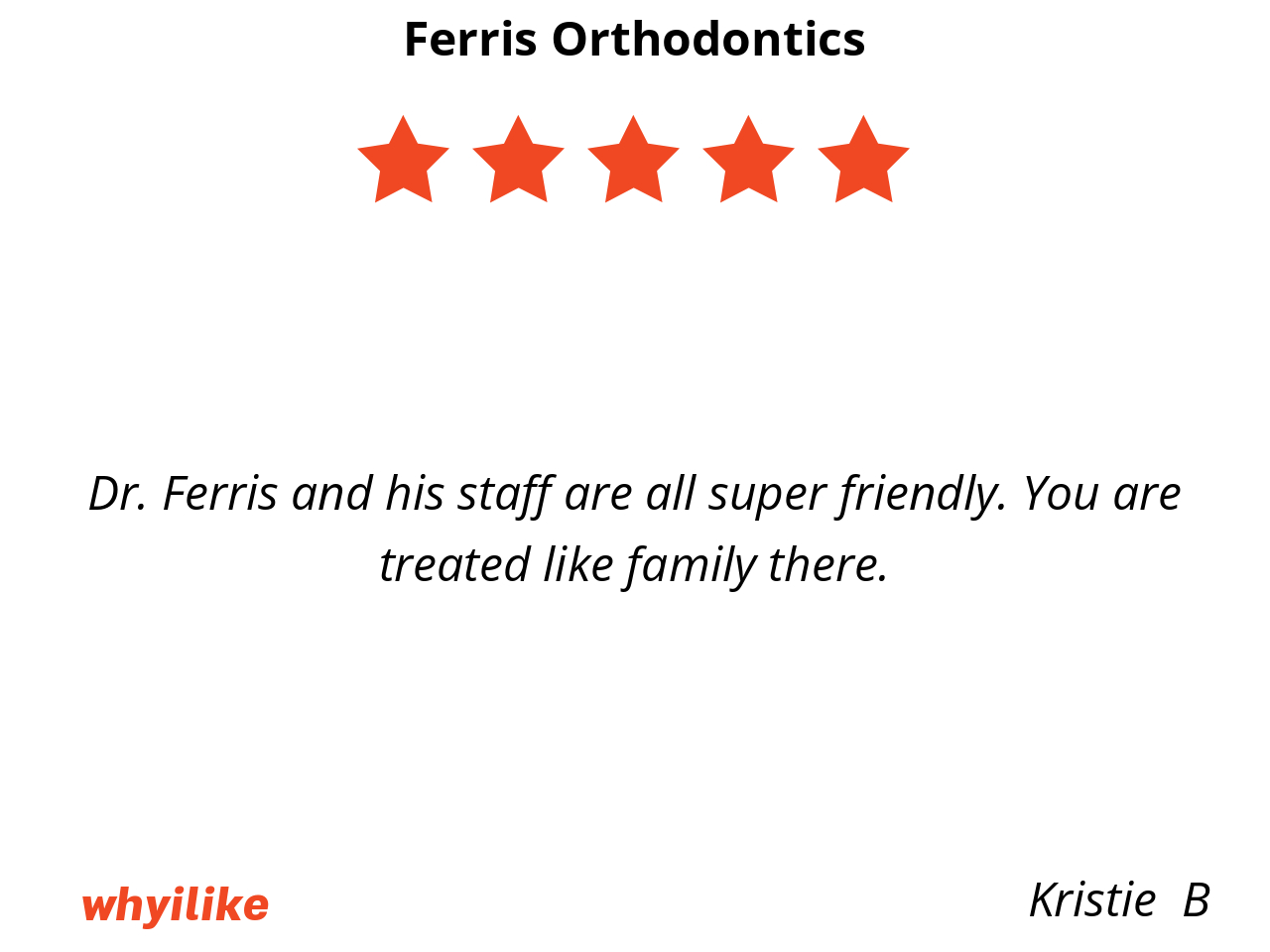 I like Ferris orthodontics because my braces are put on by smiling and kind staff. I feel free to ask questions and make sure I understand what is happening in my mouth and how to take care of it.