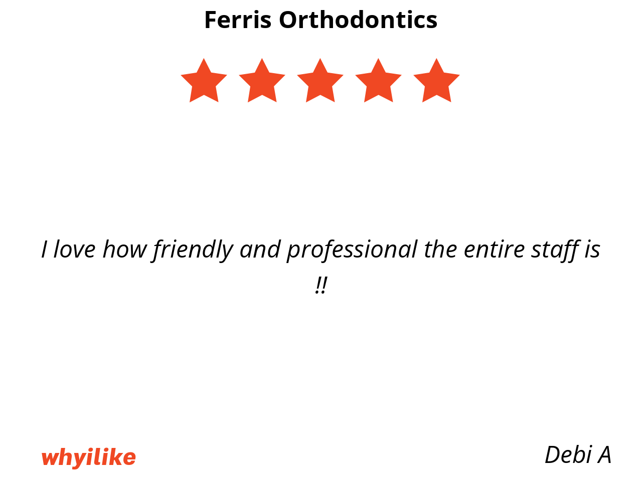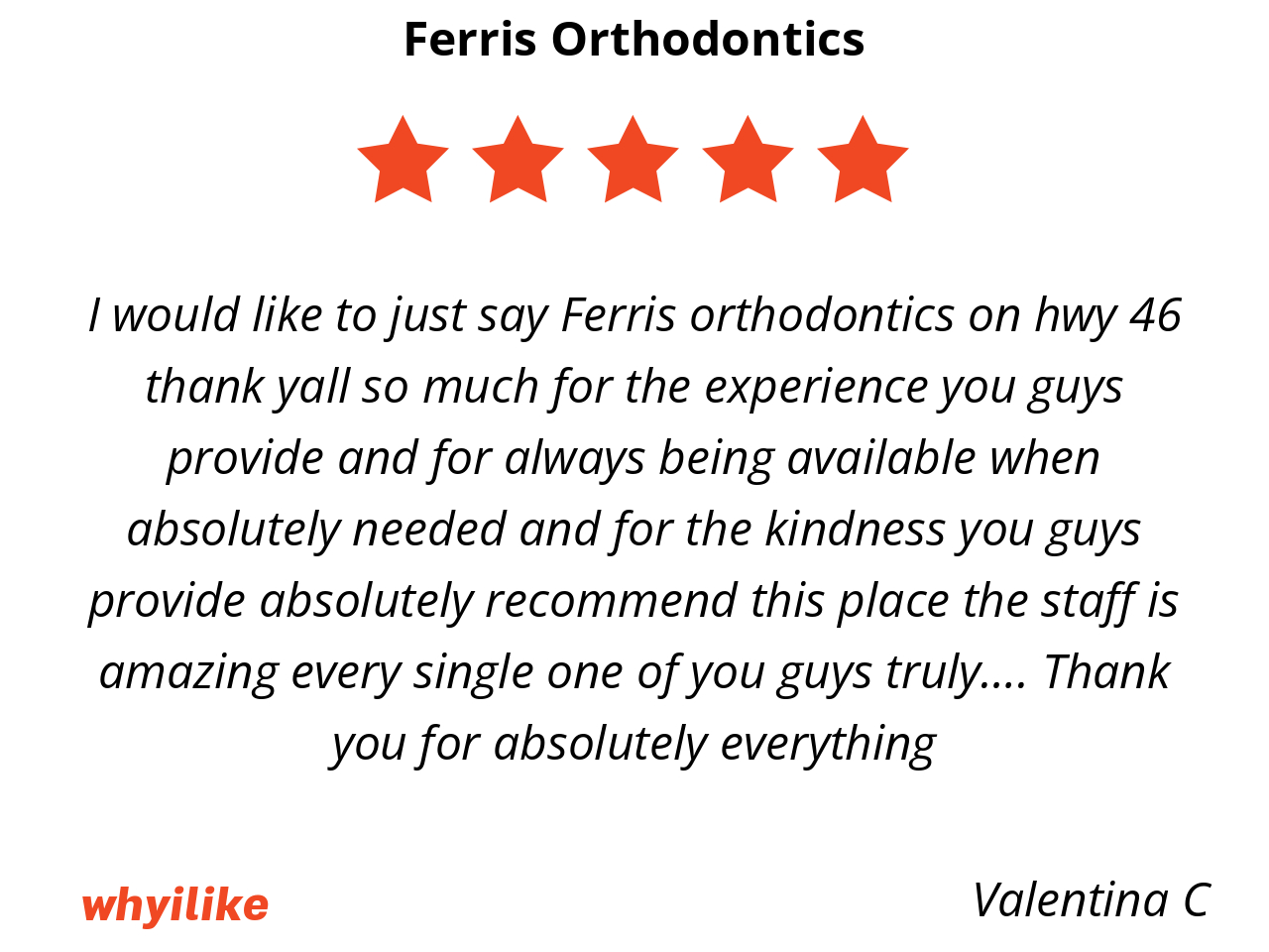 I would like to just say Ferris orthodontics on hwy 46 thank yall so much for the experience you guys provide and for always being available when absolutely needed and for the kindness you guys provide absolutely recommend this place the staff is amazing every single one of you guys truly…. Thank you for absolutely everything