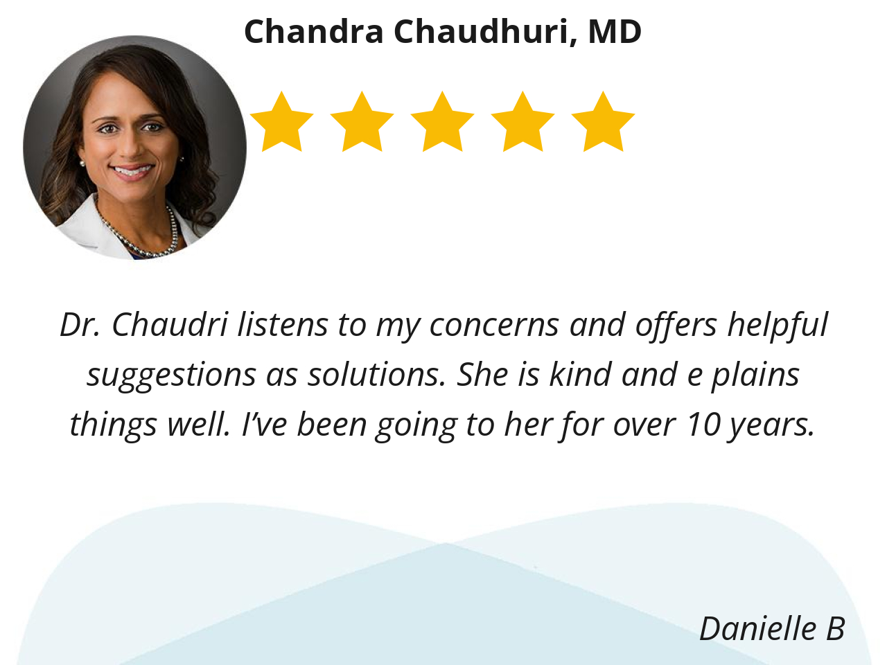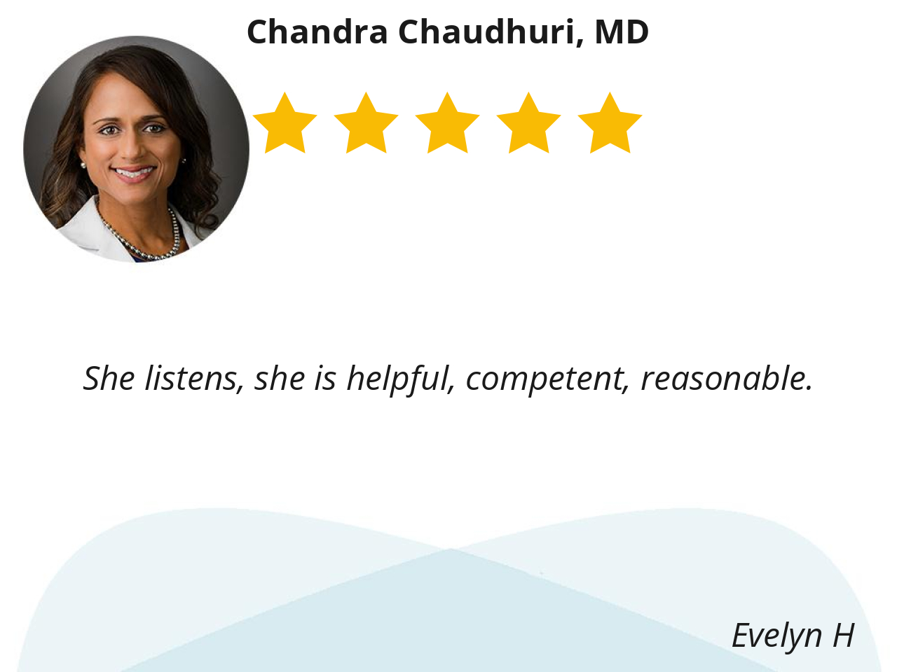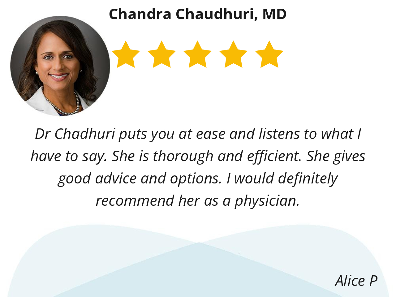 Dr Chadhuri puts you at ease and listens to what I have to say. She is thorough and efficient. She gives good advice and options. I would definitely recommend her as a physician.