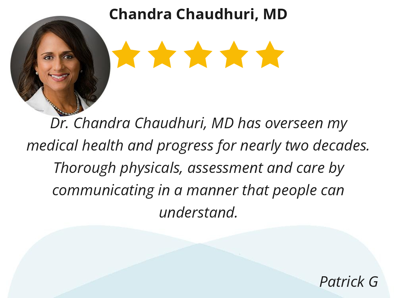 Dr. Chandra Chaudhuri, MD has overseen my medical health and progress for nearly two decades. Thorough physicals, assessment and care by communicating in a manner that people can understand.