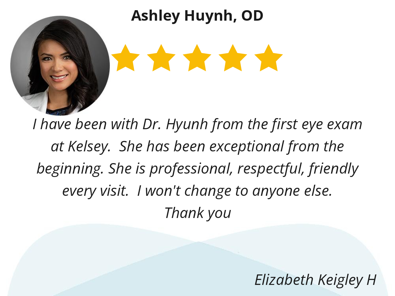 I have been with Dr. Hyunh from the first eye exam at Kelsey. She has been exceptional from the beginning. She is professional, respectful, friendly every visit. I won't change to anyone else.