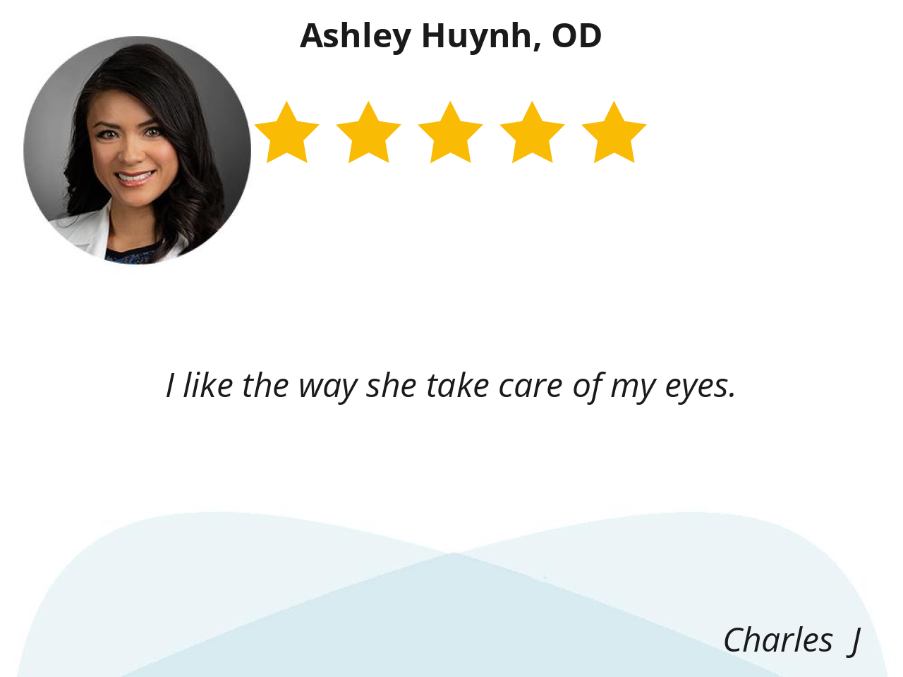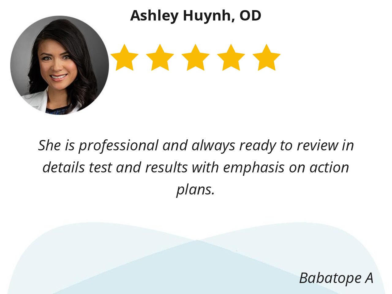 Dr. Huynh is personable, friendly and very knowledgeable. I have total confidence in her care of my eyes. She is a favorite of all my doctors. I always look forward to seeing her.