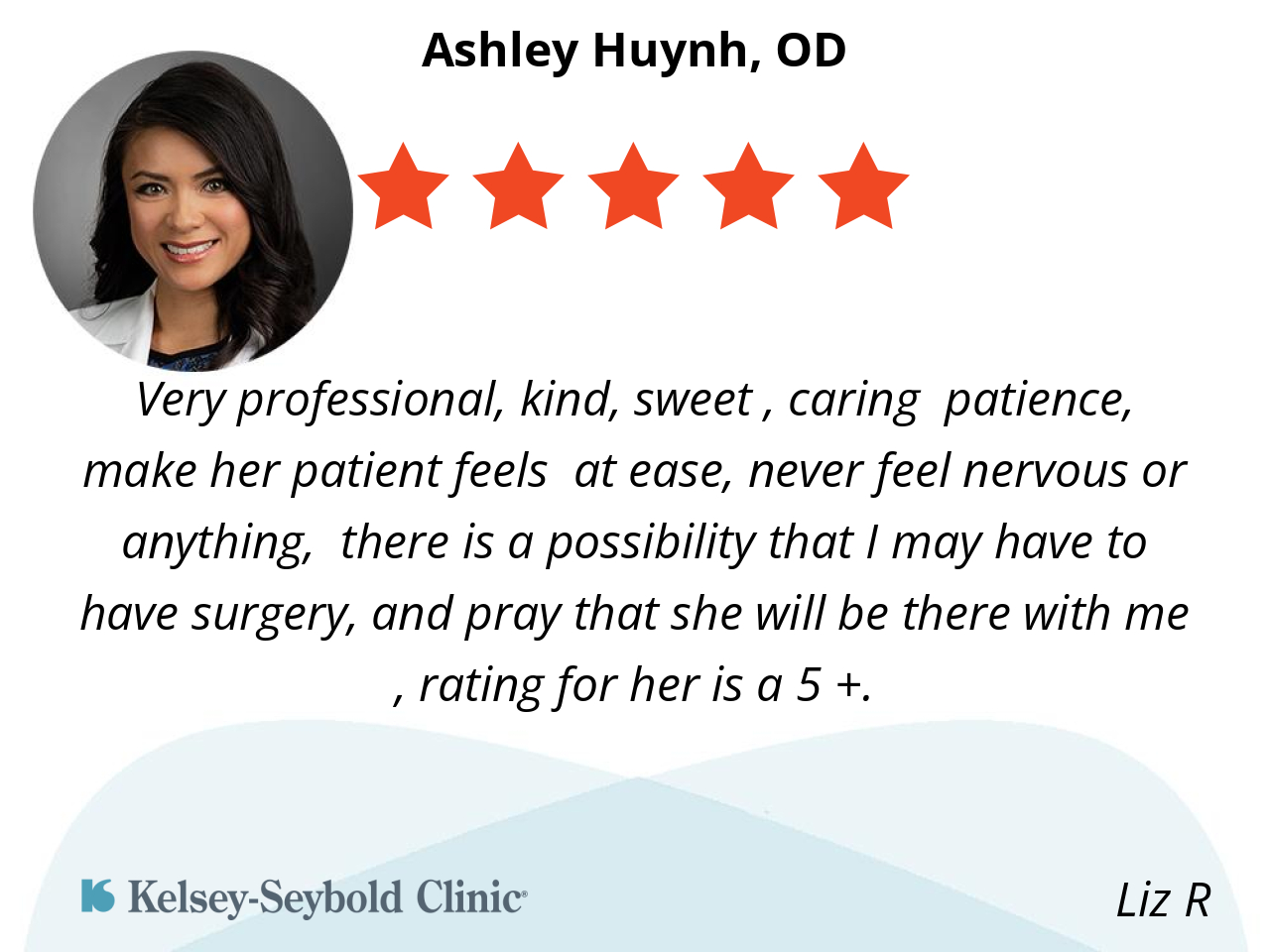 Very professional, kind, sweet , caring patience, make her patient feels at ease, never feel nervous or anything, there is a possibility that I may have to have surgery, and pray that she will be there with me , rating for her is a 5 +.
