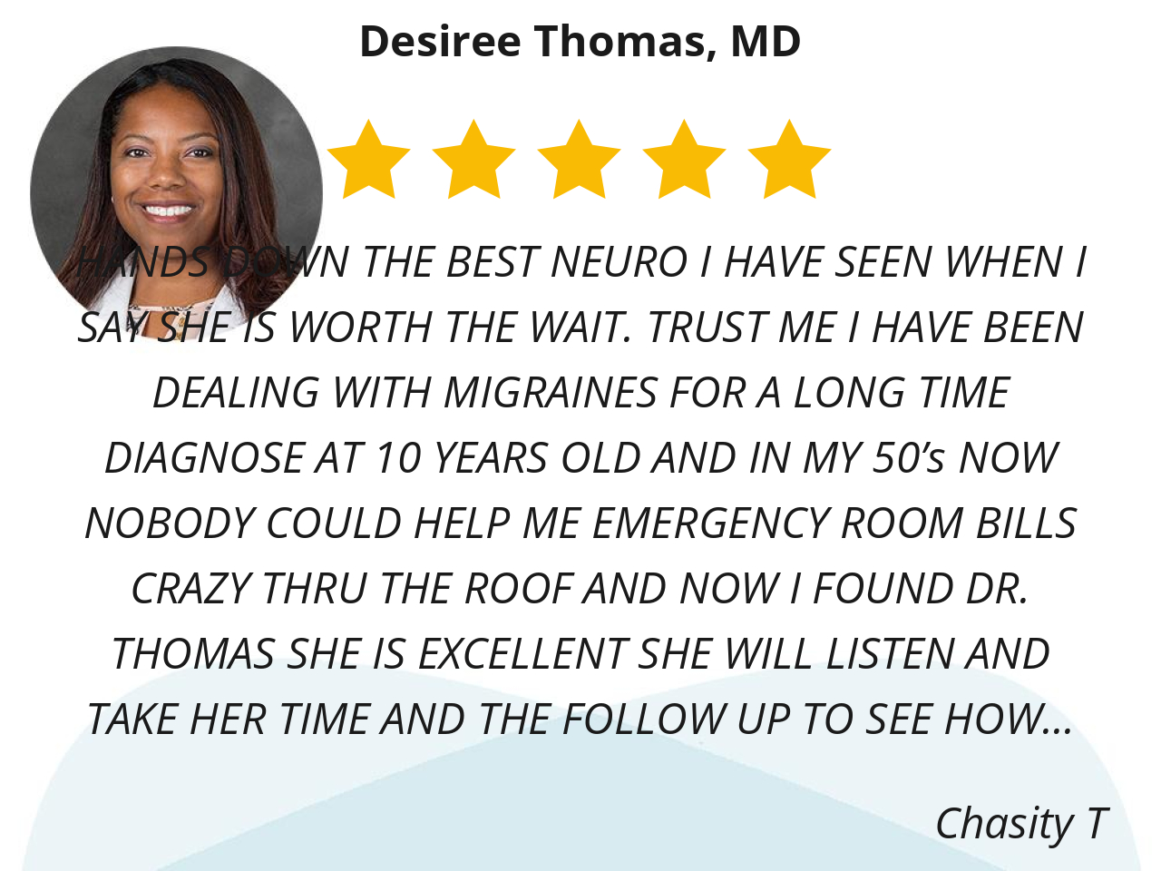HANDS DOWN THE BEST NEURO I HAVE SEEN WHEN I SAY SHE IS WORTH THE WAIT. TRUST ME I HAVE BEEN DEALING WITH MIGRAINES FOR A LONG TIME DIAGNOSE AT 10 YEARS OLD AND IN MY 50’s NOW NOBODY COULD HELP ME EMERGENCY ROOM BILLS CRAZY THRU THE ROOF AND NOW I FOUND DR. THOMAS SHE IS EXCELLENT SHE WILL LISTEN AND TAKE HER TIME AND THE FOLLOW UP TO SEE HOW MEDICATION IS WORKING HANDS DOWN EXCELLENT DOCTOR NOW IM REFERRING MY DAUGHTER WHO NOW HAS MIGRAINES IN HER 20’s