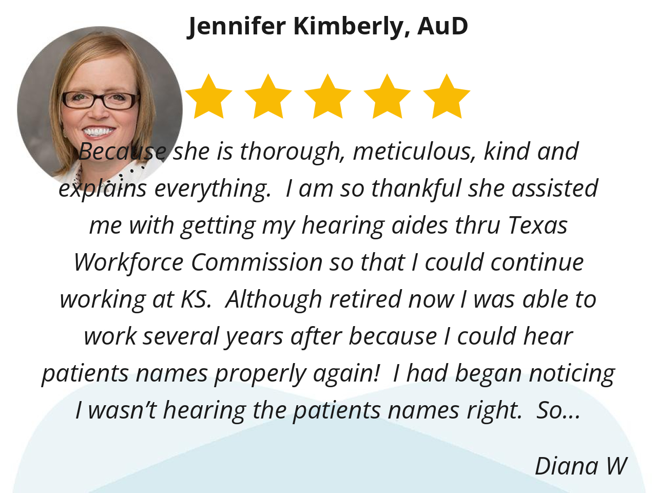 Because she is thorough, meticulous, kind and explains everything. I am so thankful she assisted me with getting my hearing aides thru Texas Workforce Commission so that I could continue working at KS. Although retired now I was able to work several years after because I could hear patients names properly again! I had began noticing I wasn’t hearing the patients names right. So grateful! Sorry to hear KS won’t be working with TWC anymore, I know of several others that benefitted from it and was able to continue working due to hearing.