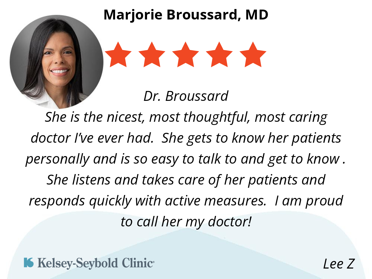 Dr. Broussard has taken care of me for many many years and every time she is so kind and thorough in seeing I am taken care of. I appreciate her so much and feel I am in great hands with her overseeing my health as an elderly patient.
