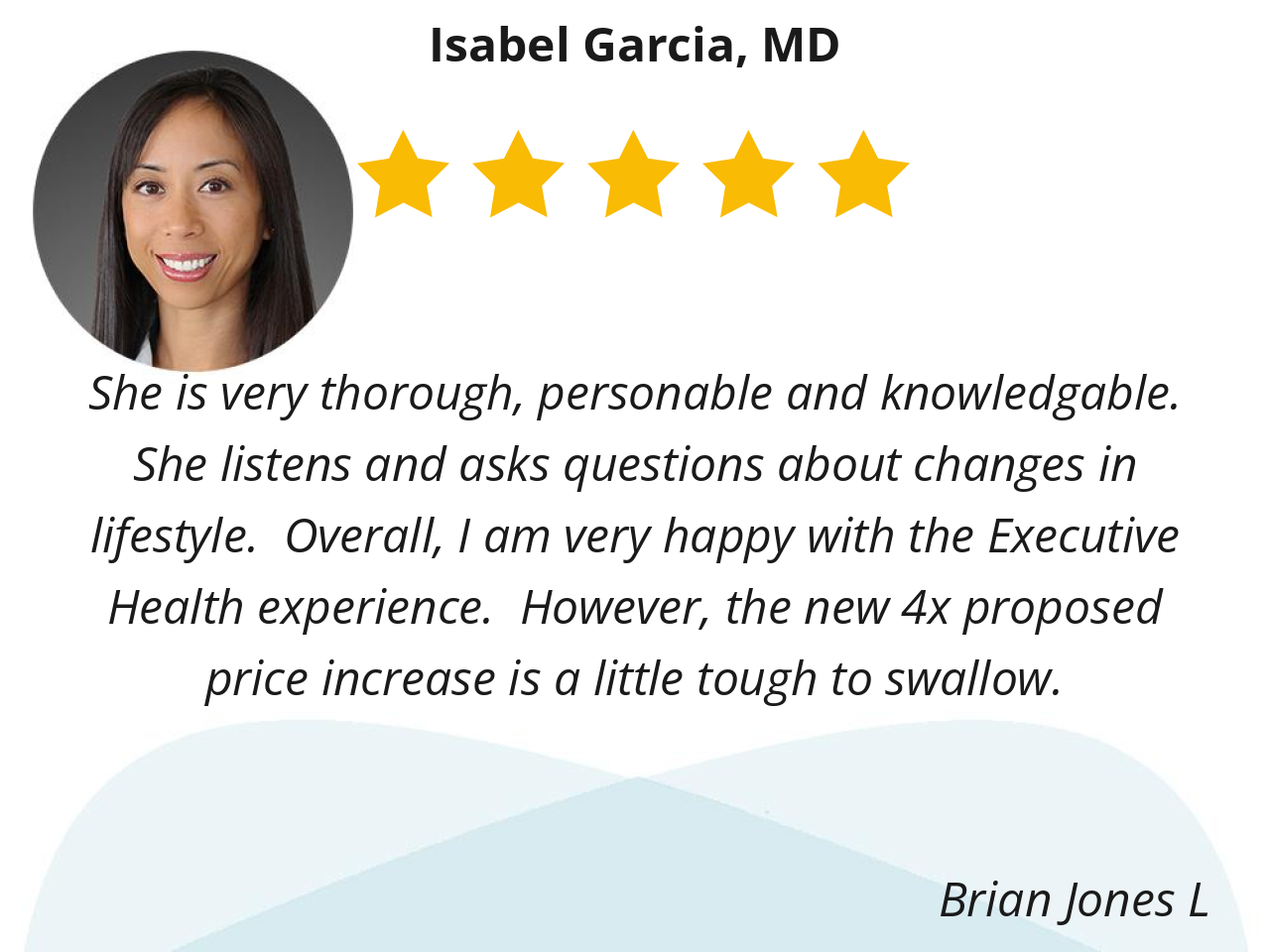 She is very thorough, personable and knowledgable. She listens and asks questions about changes in lifestyle. Overall, I am very happy with the Executive Health experience. However, the new 4x proposed price increase is a little tough to swallow.