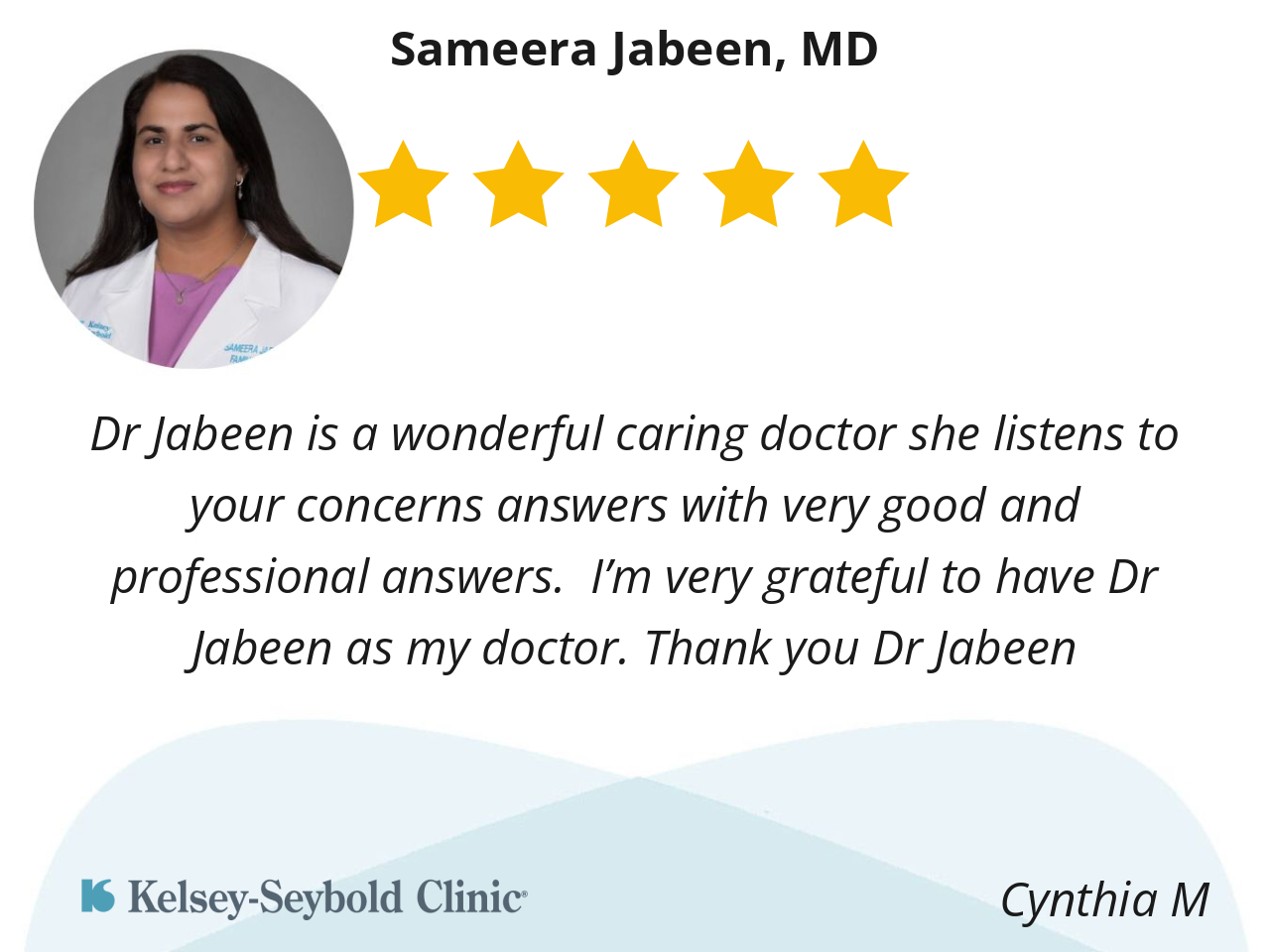 Dr Jabeen is a wonderful caring doctor she listens to your concerns answers with very good and professional answers. I’m very grateful to have Dr Jabeen as my doctor. Thank you Dr Jabeen