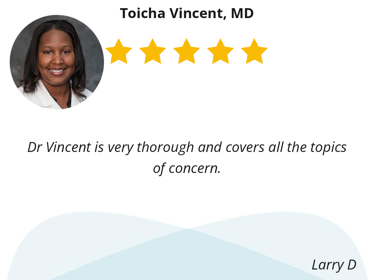 We have been seeing Dr. Toicha Vincent since 2022, and she has been an incredible primary care physician for both my husband and me. Since relocating to Houston almost six years ago, finding a provider we truly trust was important to us — and Dr. Vincent has exceeded every expectation.