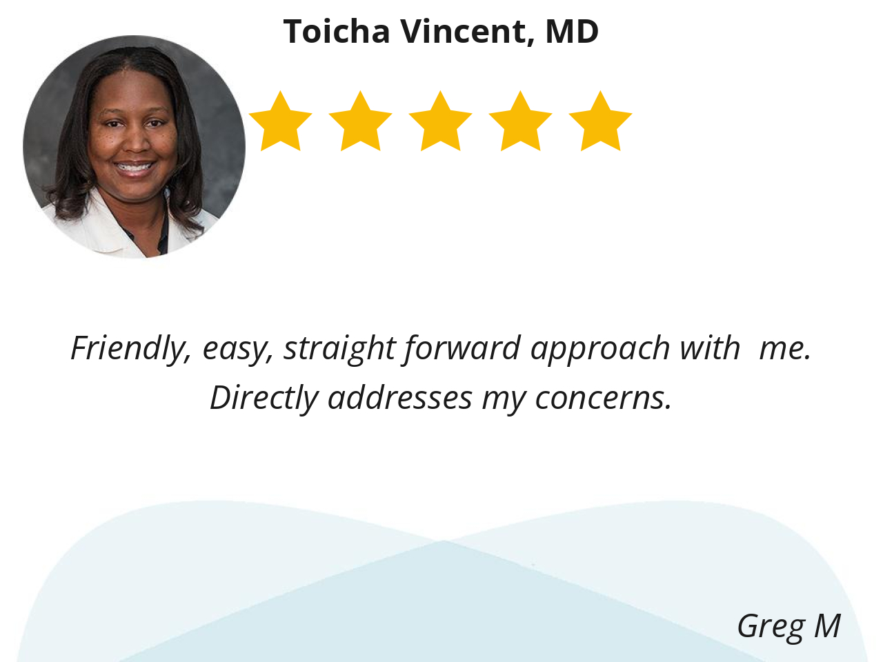 Dr. Vincent represents everything you would hope for in a primary care physician — expertise, compassion, and genuine care for her patients. We look forward to continuing our care with her and her team for many years to come. We highly recommend her to anyone looking for an outstanding primary care provider.