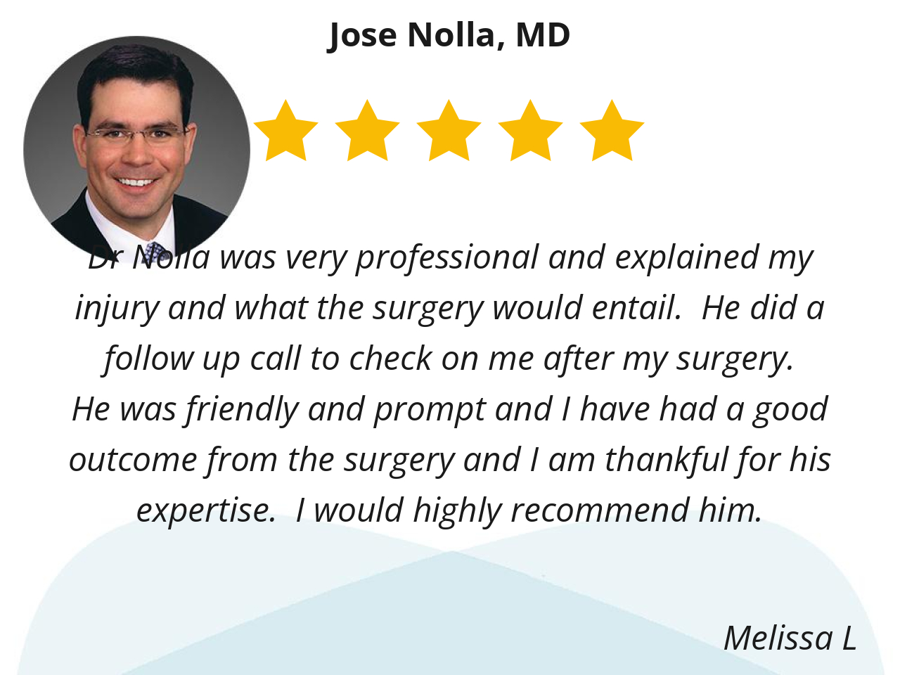 Dr Nolla was very professional and explained my injury and what the surgery would entail. He did a follow up call to check on me after my surgery.