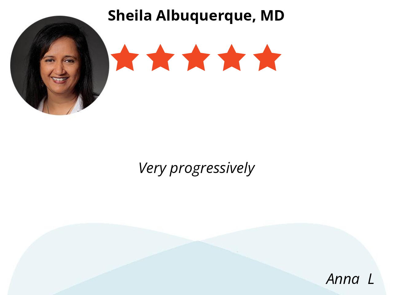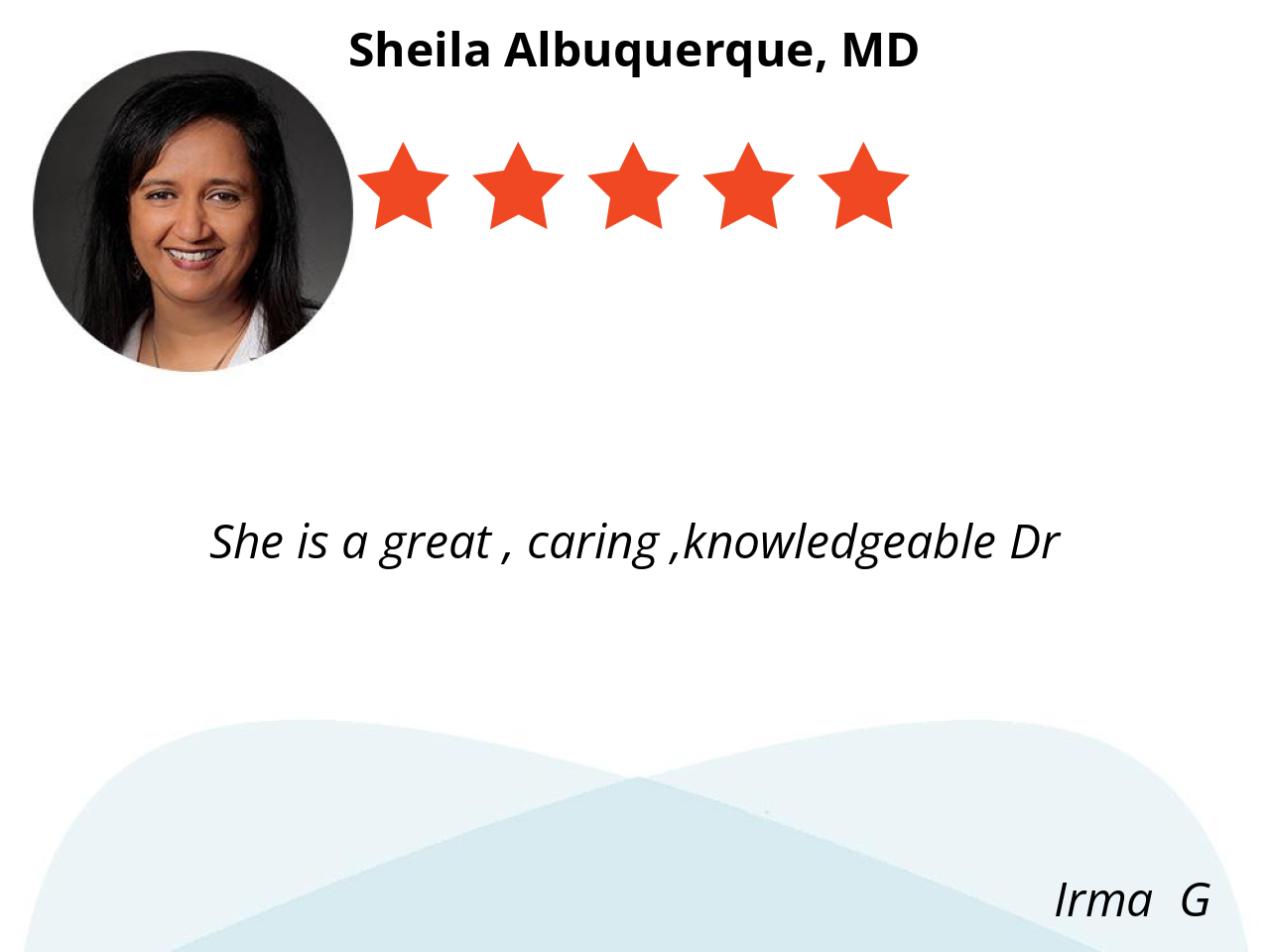 Dr. Albuquerque is an extremely knowledgeable doctor. I am so thankful to her for finding a serious health problem I have and treating it. I have a hearing problem & cannot always understand everything she says. I've missed some key instructions I think because of that problem. I may need more written instructions. She and her team are excellent.