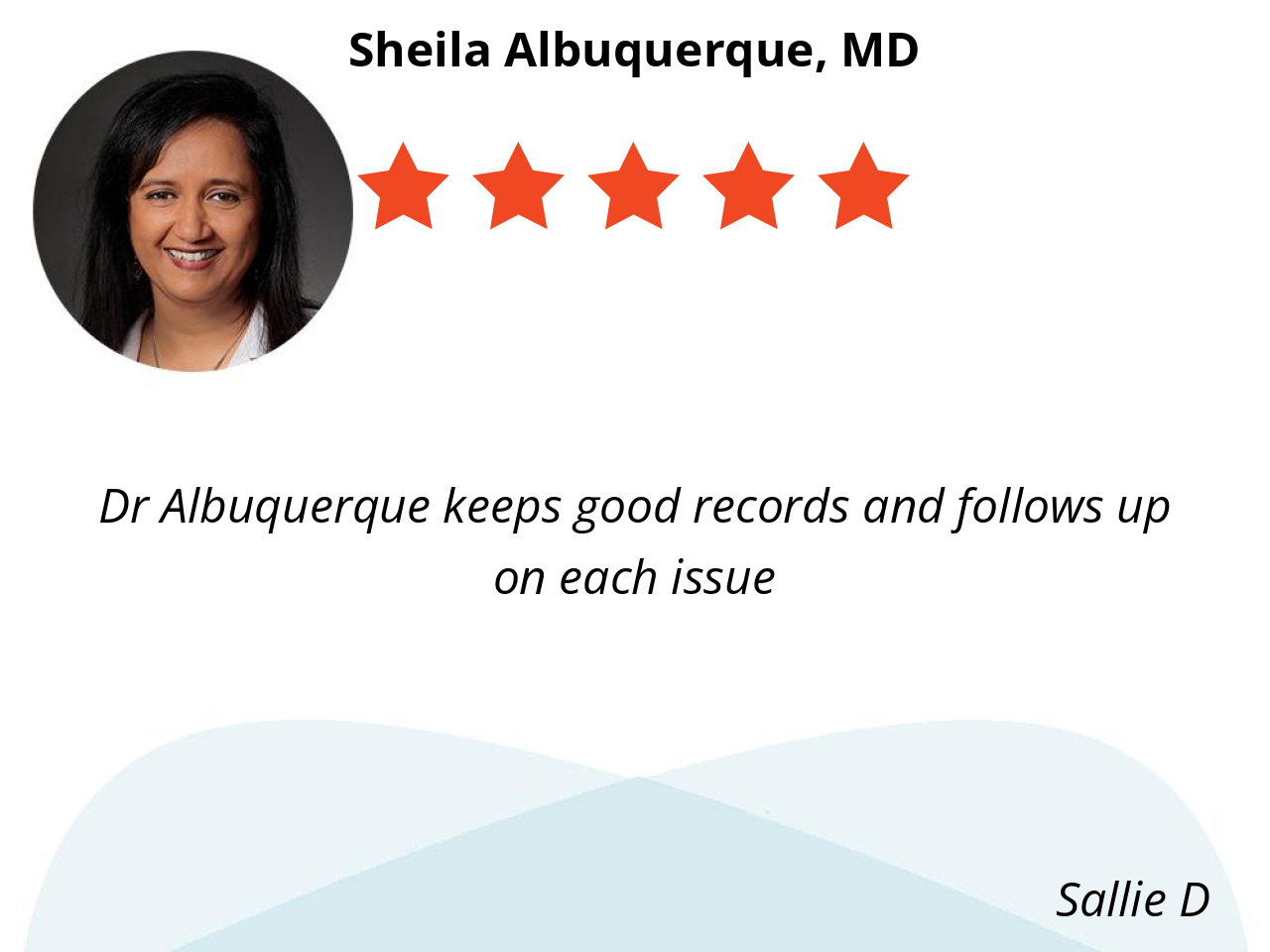 Dr. Albuquerque is very thorough in her evaluation of the issues that you are having and I feel that she really cares about her patients. She will give you a choice of options for your treatment and makes sure that you understand them. She is very no-nonsense in her treatment but I also find her to be compassionate also. I have been very pleased with her.