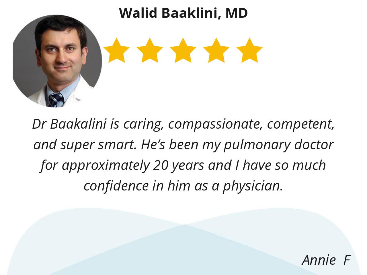 Dr Baakalini is caring, compassionate, competent, and super smart. He’s been my pulmonary doctor for approximately 20 years and I have so much confidence in him as a physician.