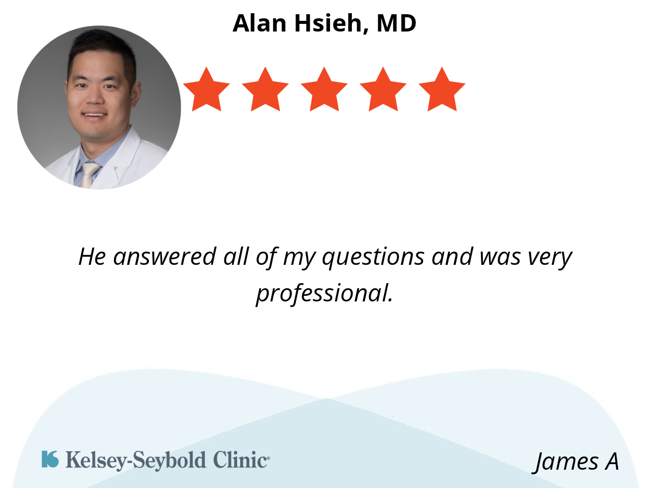 Dr. Hsieh is a wonderful doctor! He cares about his patients. He is kind and very respectful. He also is very patient in explaining and answering any questions you may have. I am so glad that he is my doctor!
