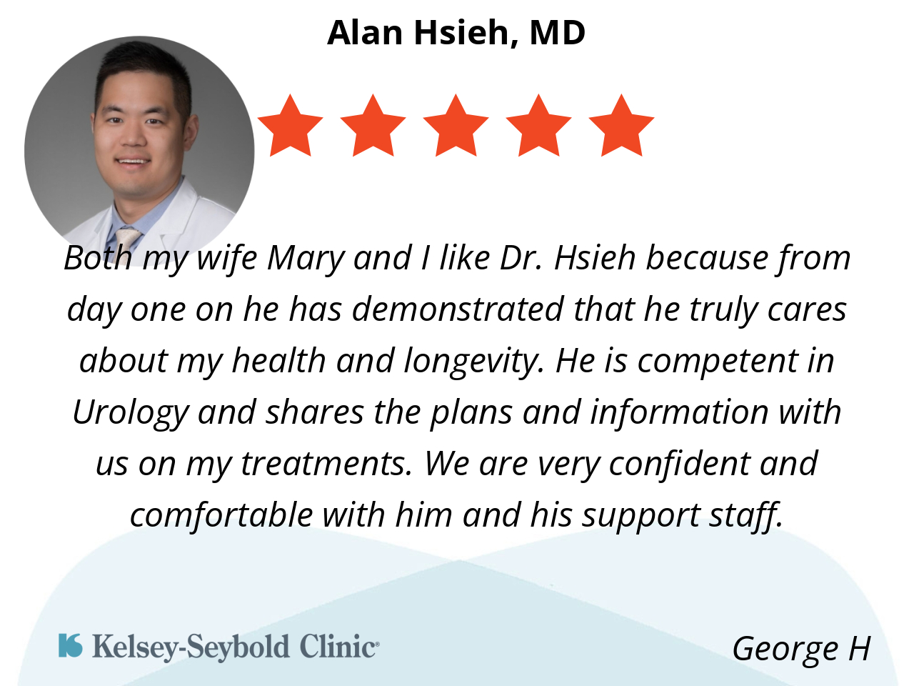 Both my wife Mary and I like Dr. Hsieh because from day one on he has demonstrated that he truly cares about my health and longevity. He is competent in Urology and shares the plans and information with us on my treatments. We are very confident and comfortable with him and his support staff.