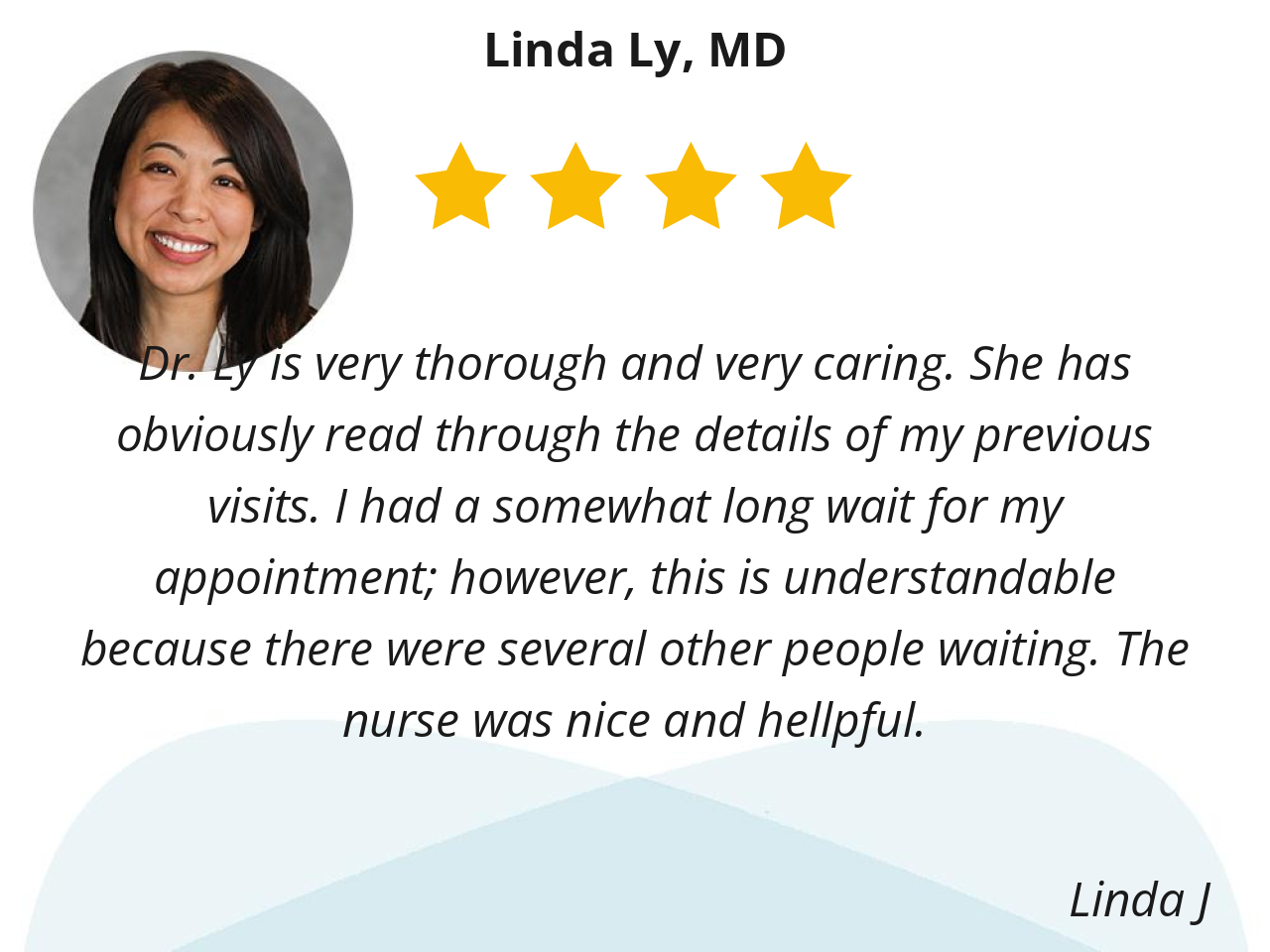 This is nothing new. It is histoical. I have known her for eighteen years as our Renowned Dr. Linda Ly.. What else do I have to say? Eighteen years is a long time. She is a kind, caring and compassionate doctor. What else can I Say? She treated all the patients alike with patience, love and care.