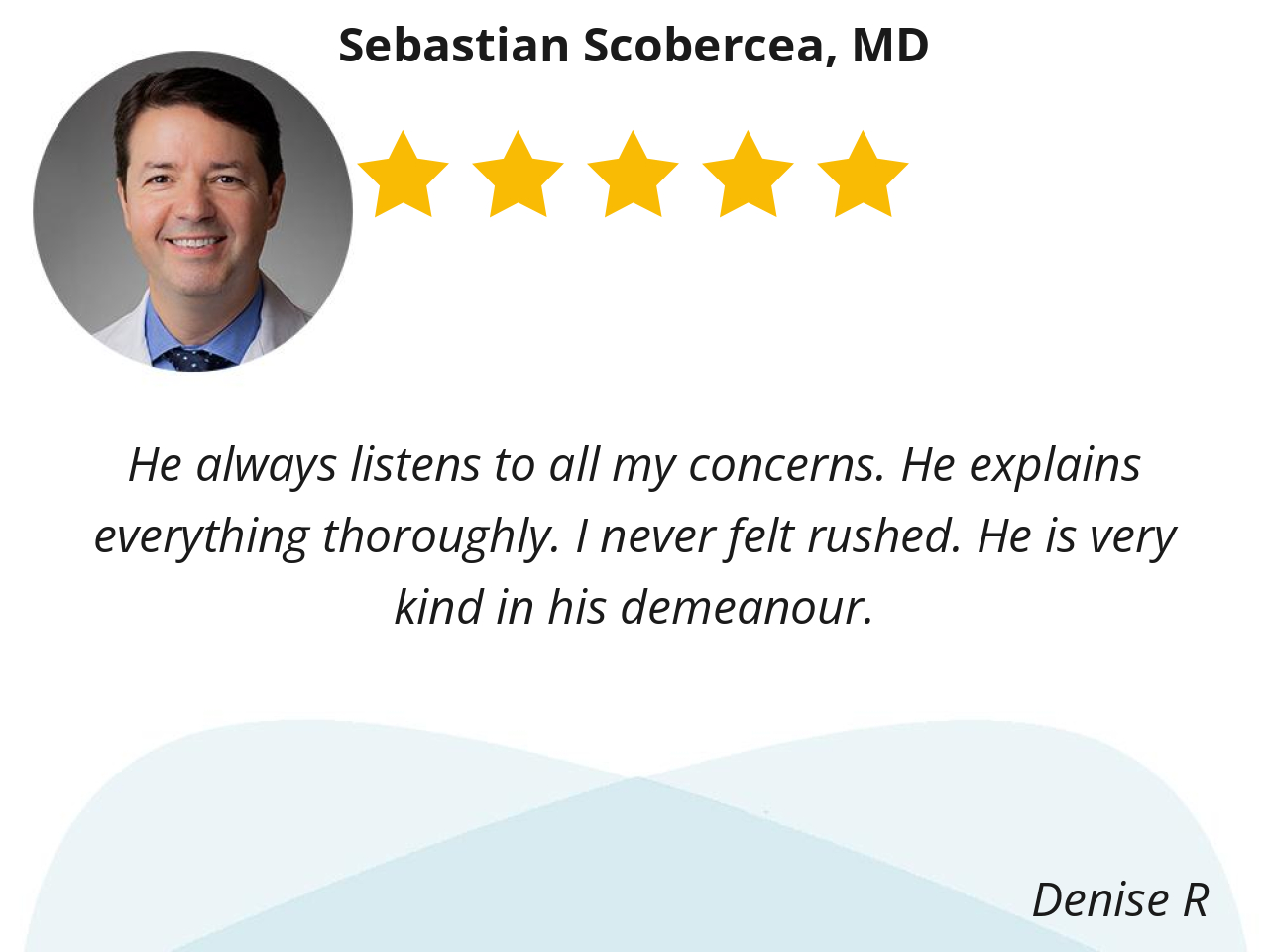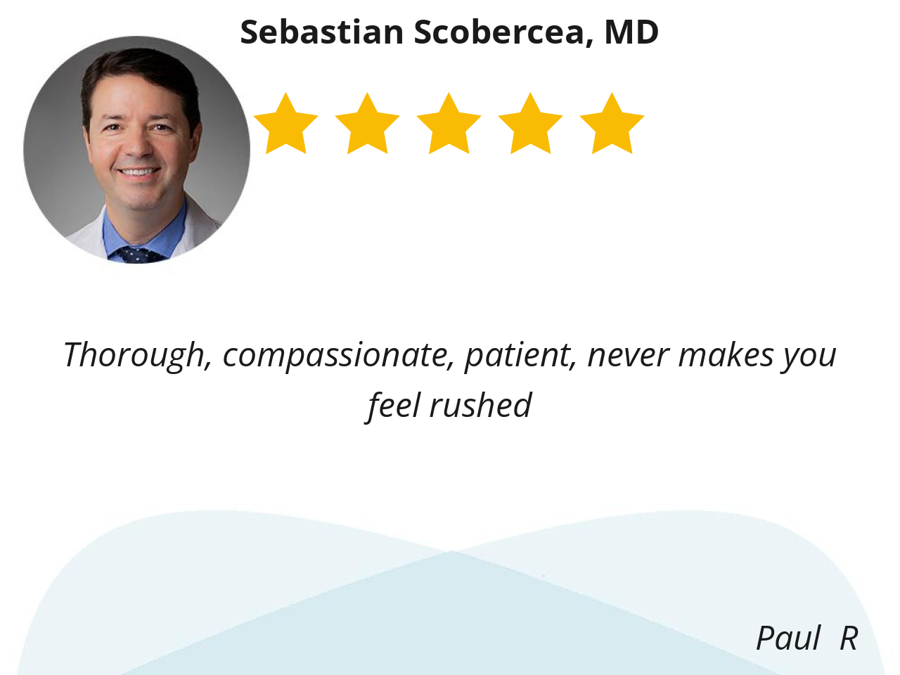 I like Dr. S Scobercea because he doesn’t rush you through your visits. He makes sure he understands what’s going on with you. Very comfortable & secure with him as my doctor. Love his bed side manners. I truth Dr. Scobercea.