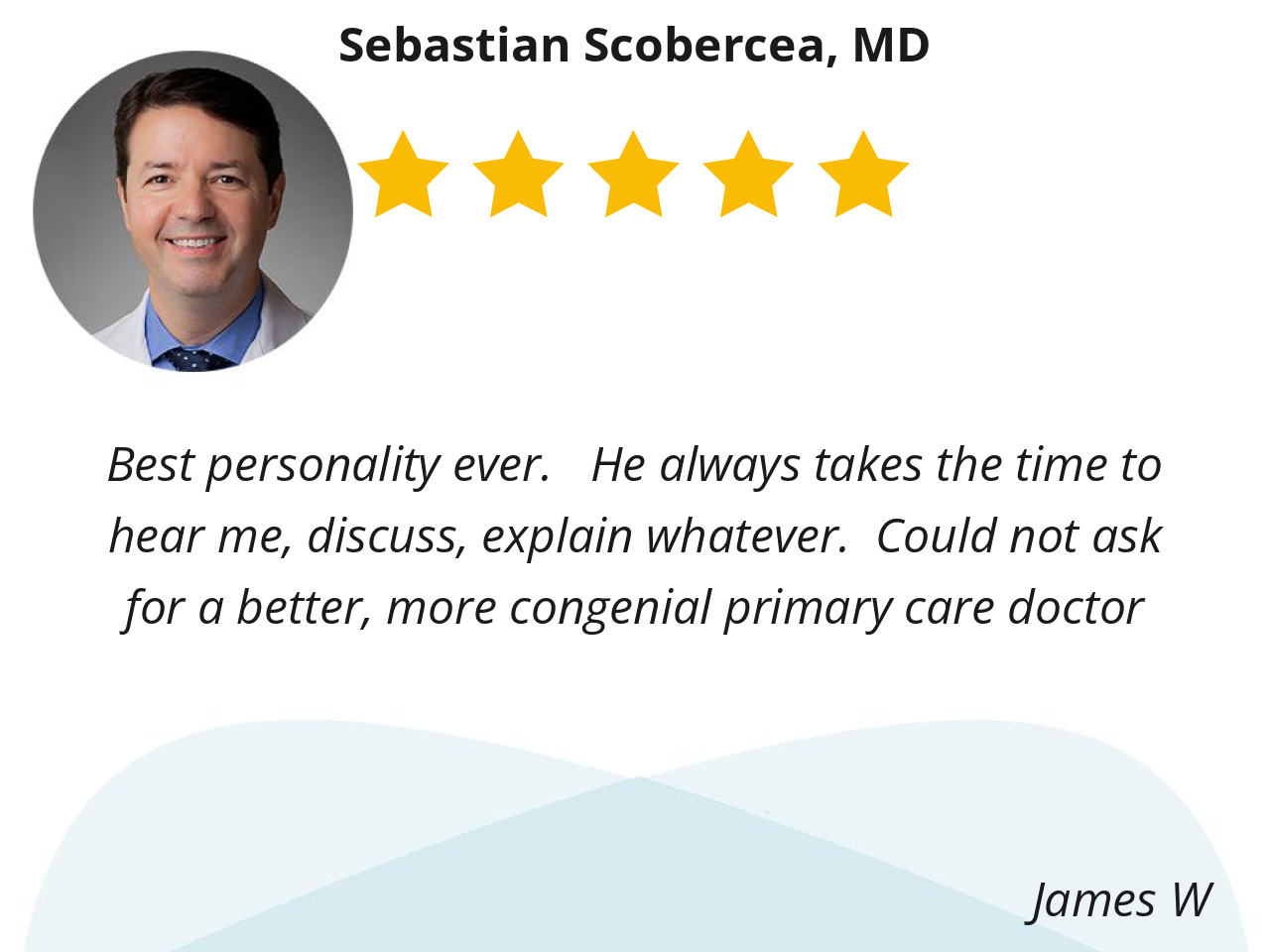 Dr Scobercea Has been my physician for more than 10 yrs. Overall he is very Caring, Nice and is not all business type of Dr. He very knowledgeable and educates you on your health results or concerns in a way that you can understand. Instead of using those big medical terminology.