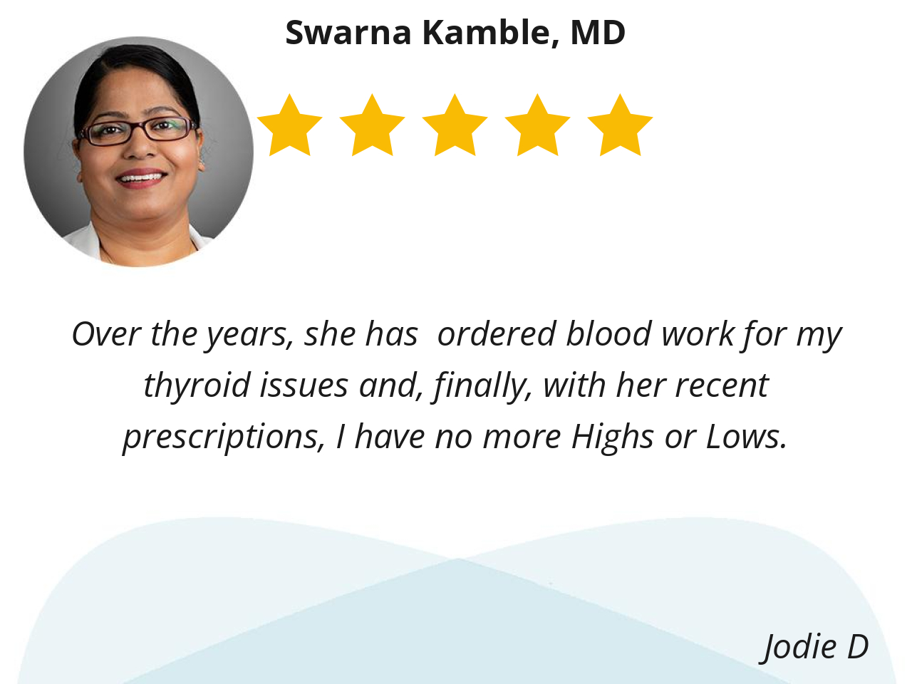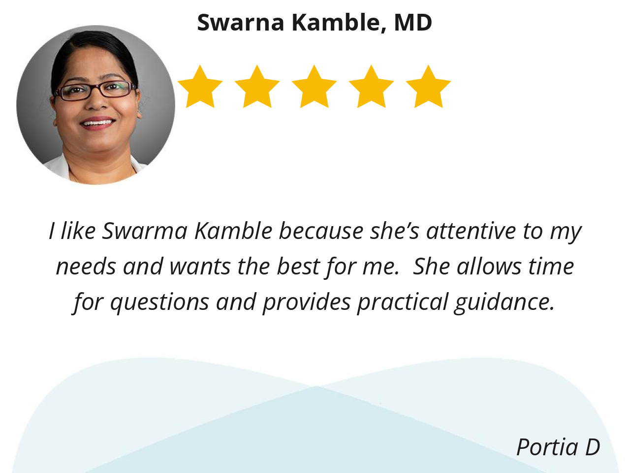 Dr. Kamble has been my doctor for many years now. I trust her with my health. She always shows concern and answers all my questions. She makes sure I understand the treatments and medications she gives me. A wonderful doctor. The best in her field.
