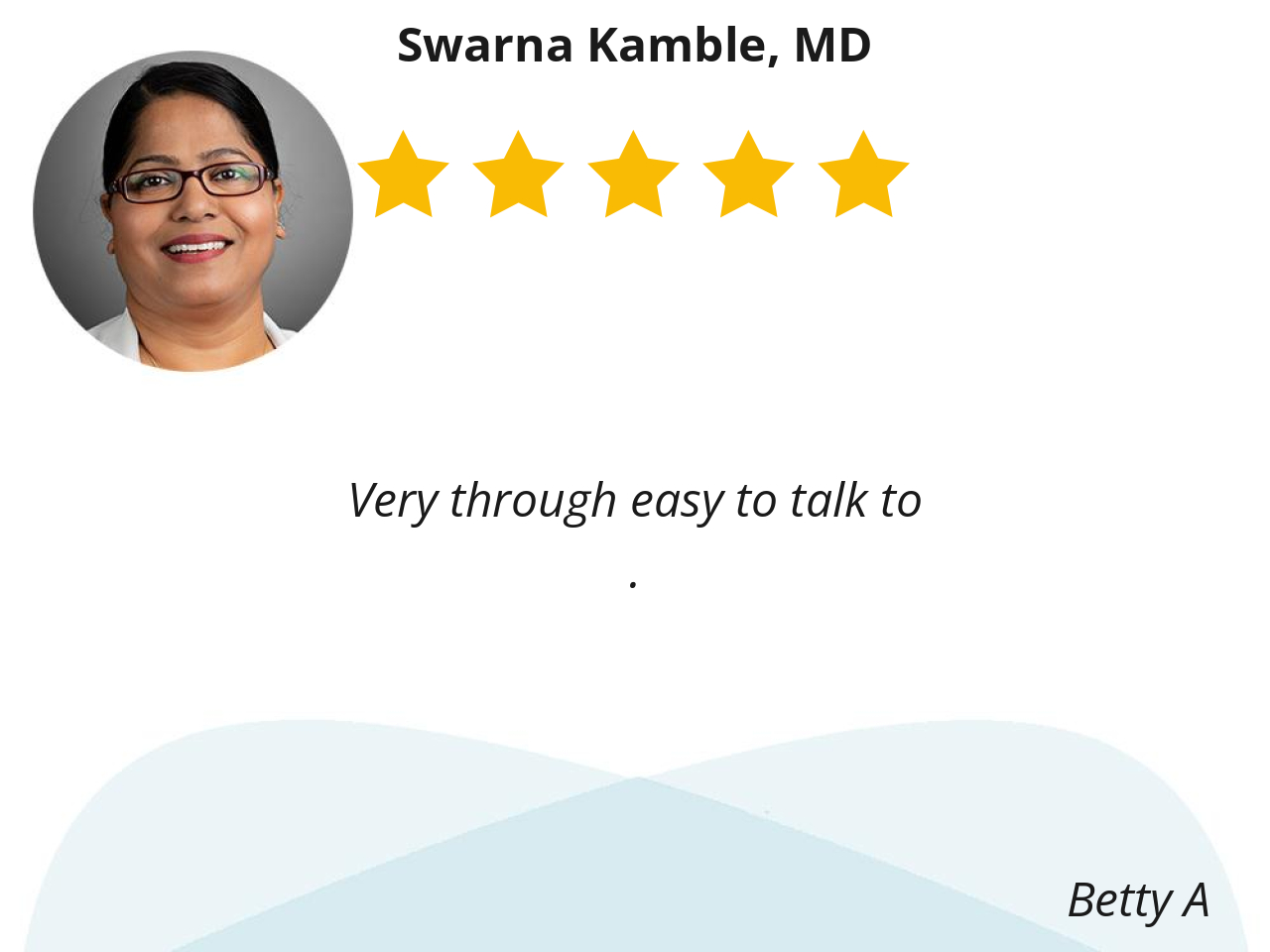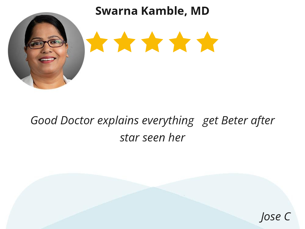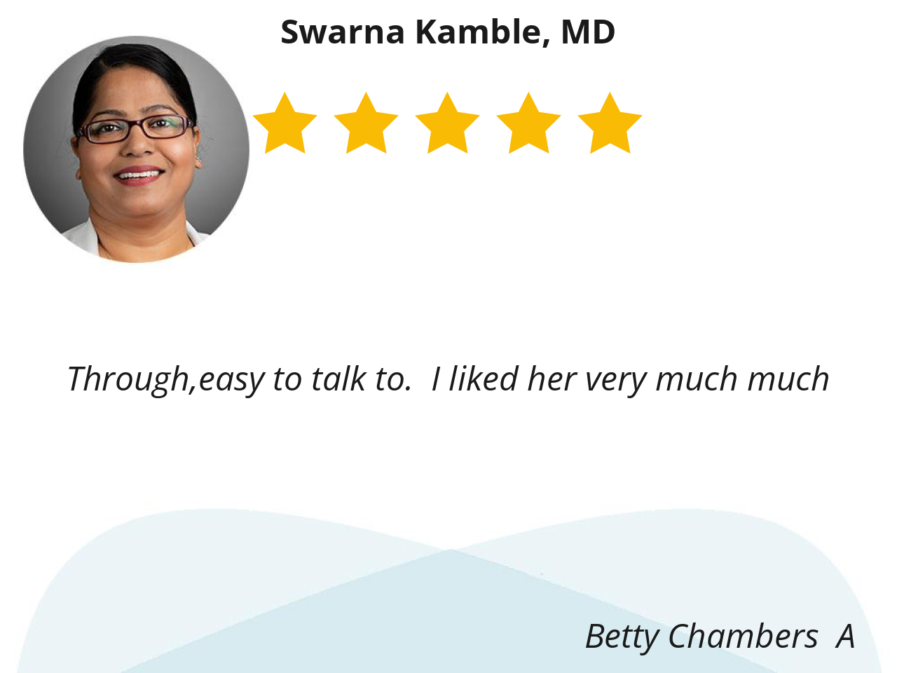 Dr Kamble has been my doctor for many years now. She always shows concern and takes the time to answer all my questions. She makes sure I understand the treatments and medications she gives me. A wonderful doctor the best in her field.