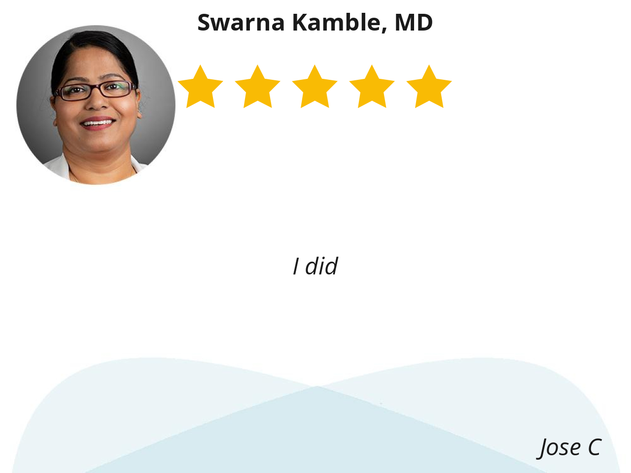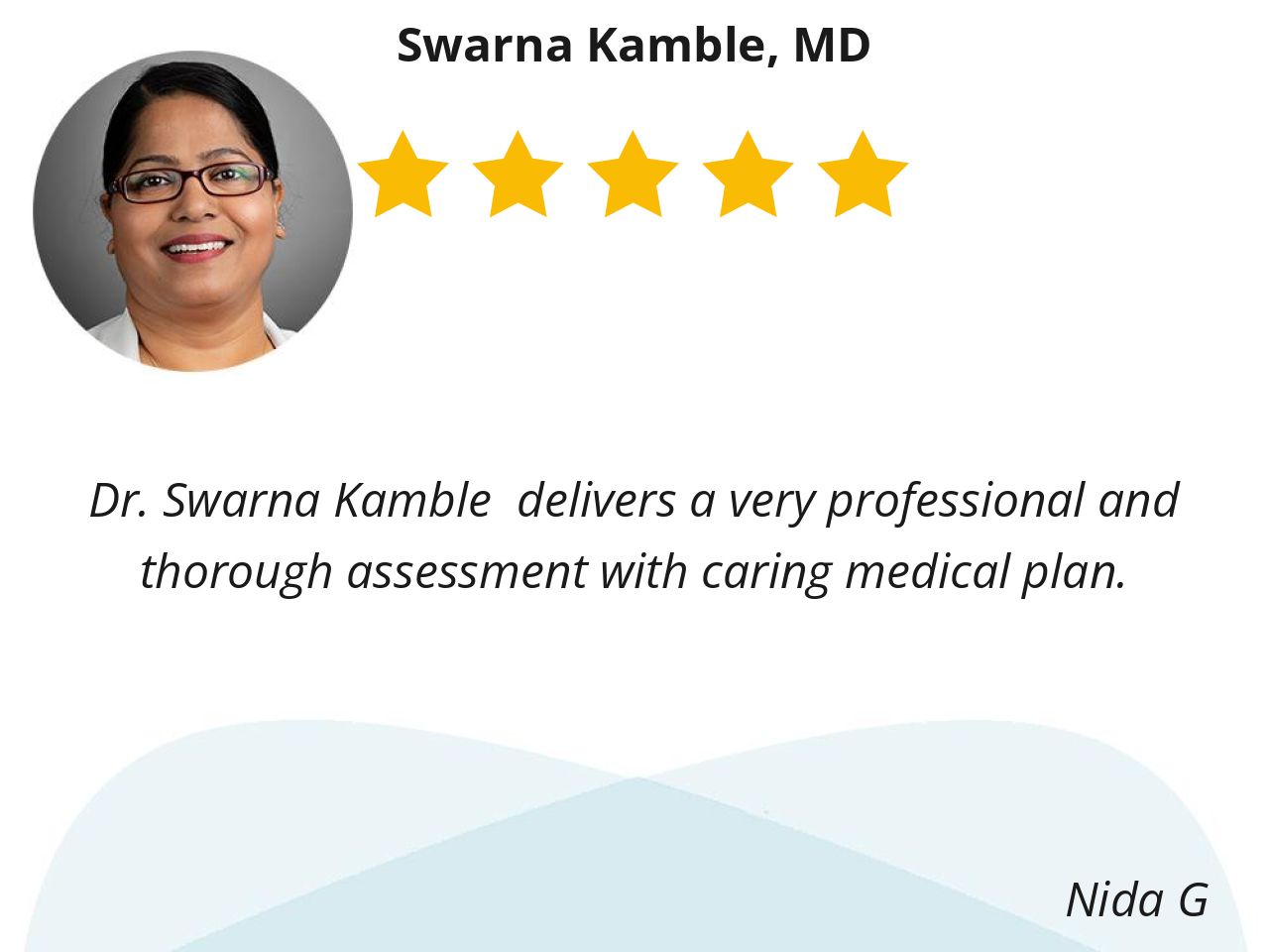 Dr Kamble has been my doctor for many years now. I trust her with my health. She shows concern and answers all my questions. She makes sure I understand the treatments and medications she gives me. A wonderful doctor. The best in her field.